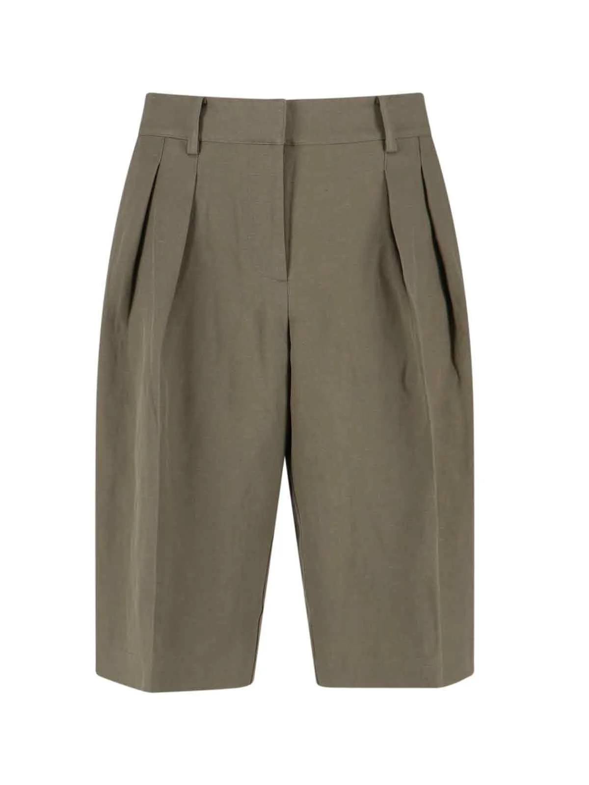THE FRANKIE SHOP 'BILBAO' BERMUDA PANTS IN GREEN LINEN BLEND WITH MID WAIST, BELT LOOPS, HOOK AND ZIP CLOSURE, FRONT PIN TUCKS, TWO SIDE POCKETS, BACK WELT POCKET, STRAIGHT LEG. PRODUCT INFO PRODUCT CODE BILBAO PLEATED LINEN BERMUDAKHAKI COMPOSITION: 67% LYOCELL, 39% LINEN SIZE AND FIT: REGULAR FIT MADE IN: CHINA