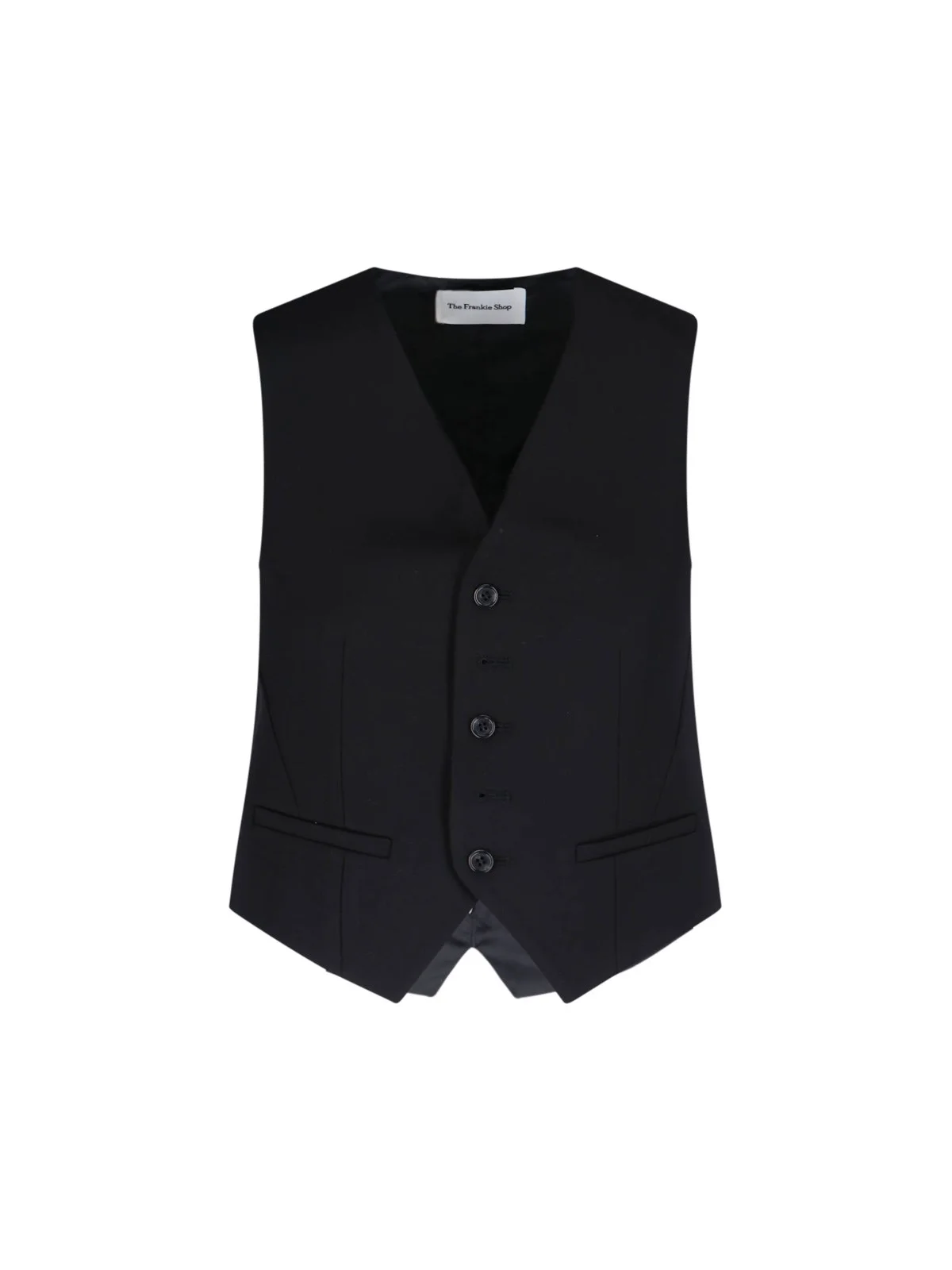 THE FRANKIE SHOP VEST WITH GELSO STRAP IN BLACK FABRIC WITH V-NECK, BUTTON CLOSURE, TWO SIDE WELT POCKETS, ADJUSTABLE BACK STRAP, AND ASYMMETRICAL HEM. PRODUCT INFO PRODUCT CODE GELSO WAISTCOATBLACK COMPOSITION: 65% LYOCELL, 25% RAYON, 10% WOOL SIZE AND FIT: SLIM FIT MADE IN: KOREA