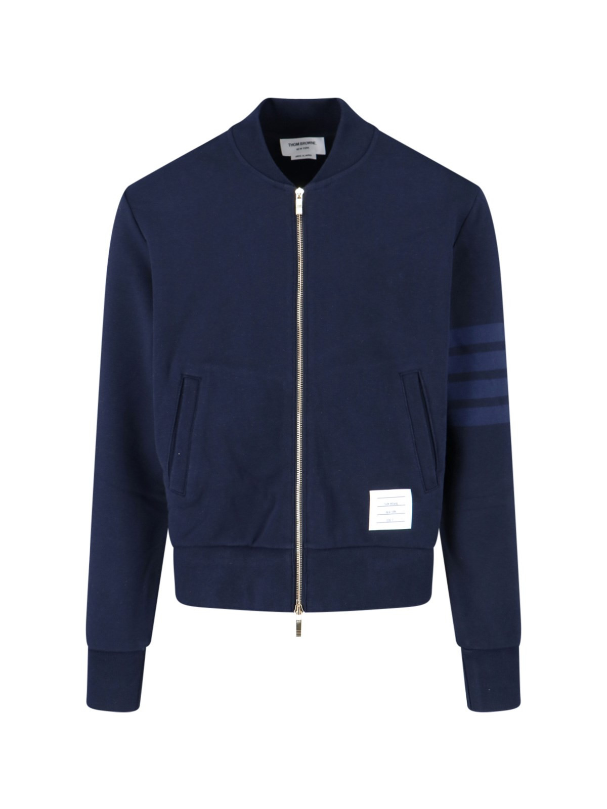 THOM BROWNE "4-BAR" NAVY BLUE COTTON BOMBER JACKET WITH RIBBED COLLAR, DOUBLE ZIP CLOSURE, TWO SIDE POCKETS, ICONIC TONE-ON-TONE STRIPE PRINT ON THE SLEEVE, TRICOLOR GROSGRAIN TONGUE ON THE BACK, RIBBED HEM AND CUFFS, STRAIGHT HEM. PRODUCT INFO PRODUCT CODE MJT280A 06910415 COMPOSITION: 100% COTTON SIZE AND FIT: REGULAR FIT MADE IN: JAPAN