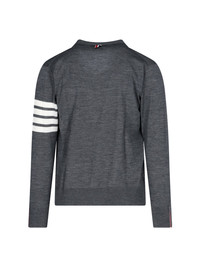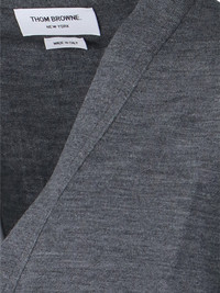 THOM BROWNE '4-BAR' GREY WOOL CARDIGAN WITH V-NECK, BUTTON CLOSURE, TWO FRONT POCKETS, ICONIC WHITE '4-BAR' INTARSIA, TRICOLOR GROSGRAIN TONGUE AT THE BACK, RIBBED TRIM, STRAIGHT HEM. PRODUCT INFO PRODUCT CODE MKC002A Y1014038 COMPOSITION: 100% WOOL SIZE AND FIT: ADJUST MADE IN: ITALIA - NUMERICAL SIZING