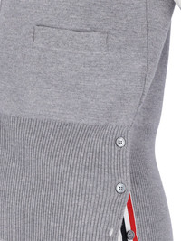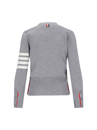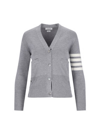 THOM BROWNE '4-BAR' GREY WOOL CARDIGAN WITH V-NECK, BUTTON CLOSURE, TWO FRONT POCKETS, ICONIC WHITE STRIPE INTARSIA SLEEVES, RIBBED TRIMS, STRAIGHT HEM. PRODUCT INFO PRODUCT CODE FKC207A 00014055 COMPOSITION: 100% WOOL SIZE AND FIT: ADJUST MADE IN: ITALIA