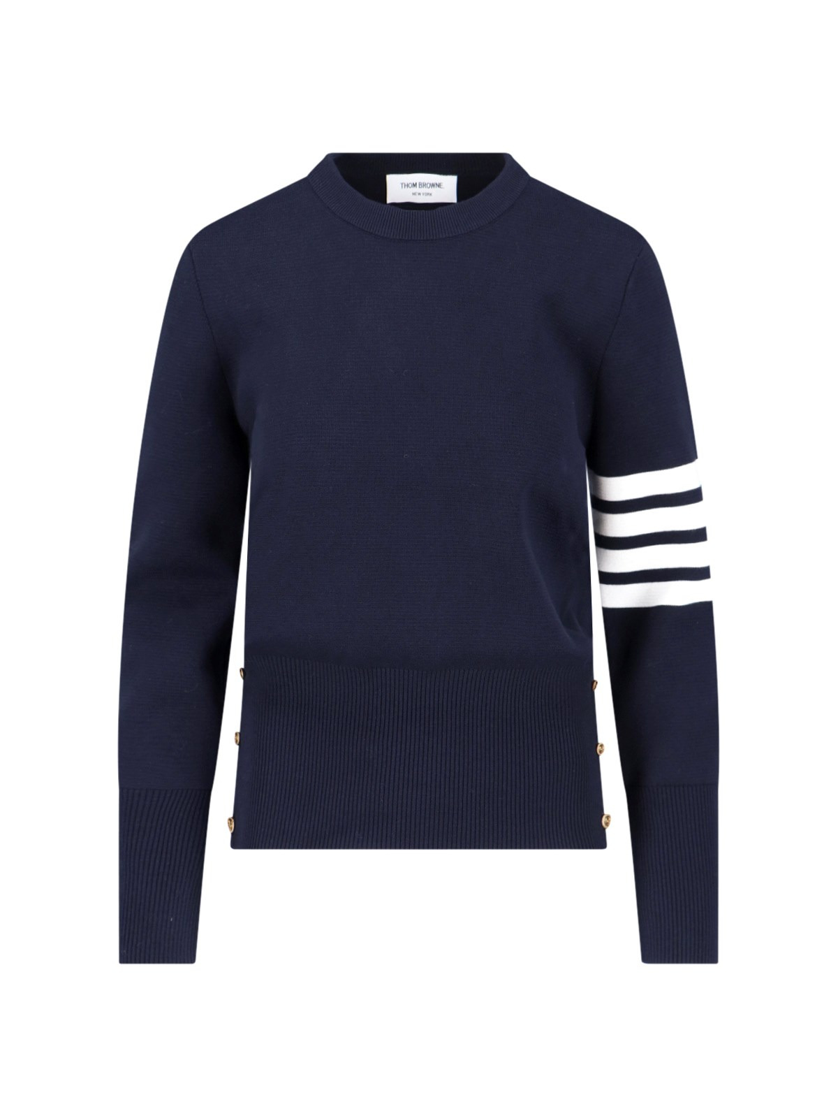 THOM BROWNE 4-BAR SWEATER IN WHITE COTTON WITH CREWNECK, WHITE BAND INTARSIA SLEEVES, SIDE BUTTONS ON THE HEM, TRICOLOR GROSGRAIN TONGUE ON THE BACK, RIBBED TRIM, AND STRAIGHT HEM. PRODUCT INFO PRODUCT CODE FKA239A 00219415 COMPOSITION: 100% COTTON SIZE AND FIT: ADJUST MADE IN: ITALIA