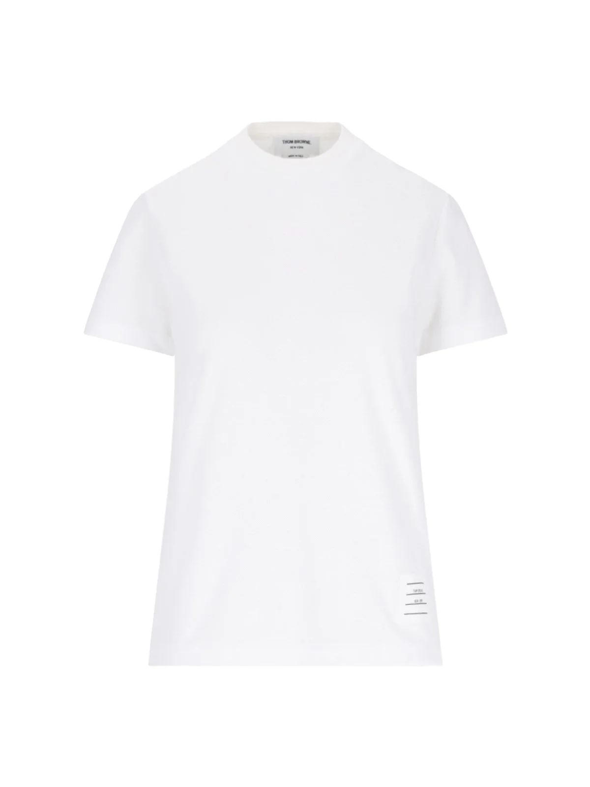 BASIC LOGO T-SHIRT THOM BROWNE, WHITE COTTON, CREW NECK, SHORT SLEEVES, LOGO PATCH ON FRONT, BUTTON DETAIL ON SIDE, TRICOLOUR GROSGRAIN TAB ON BACK, STRAIGHT HEM. PRODUCT INFO PRODUCT CODE FJS013A 00050100 - 100% COTTON - REGULAR FIT MADE IN: ITALY