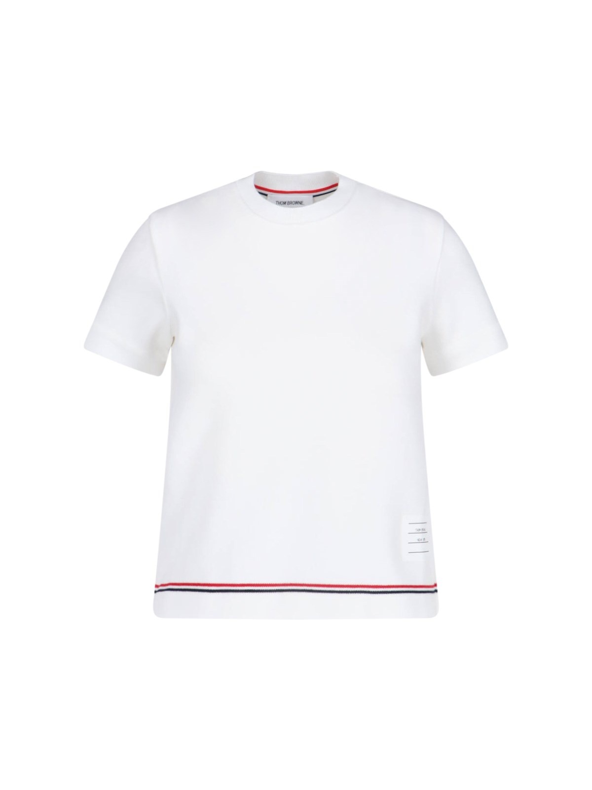 THOM BROWNE LOGO T-SHIRT IN WHITE COTTON WITH RED AND BLUE STRIPED TRIM, CREWNECK, SHORT SLEEVES, SIDE LOGO LABEL, TRICOLOR GROSS GRAIN LOGO LABEL ON THE BACK, AND STRAIGHT HEM. PRODUCT INFO PRODUCT CODE FJS193A J0185100 COMPOSITION: 95% COTTON, 5% ELASTANE SIZE AND FIT: REGULAR FIT MADE IN: ITALY