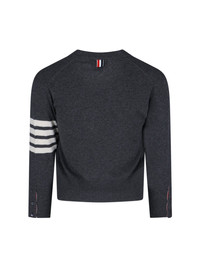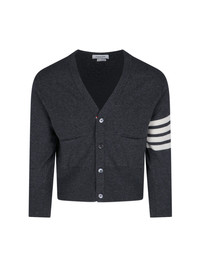 THOM BROWNE 'LOOPBACK 4-BAR' CARDIGAN IN DARK GREY CASHMERE WITH V-NECK, BUTTON CLOSURE, TWO FRONT PATCH POCKETS, ICONIC CONTRASTING BANDS ON THE SIDE, TRICOLOR GROSGRAIN LOGO LABEL ON THE BACK, BUTTON CUFFS, RIBBED TRIMS, STRAIGHT HEM. PRODUCT INFO PRODUCT CODE MKCS01A 00011038 COMPOSITION: 100% CASHMERE SIZE AND FIT: REGULAR FIT MADE IN: SCOTLAND - "NUMERIC" SIZE SCALE