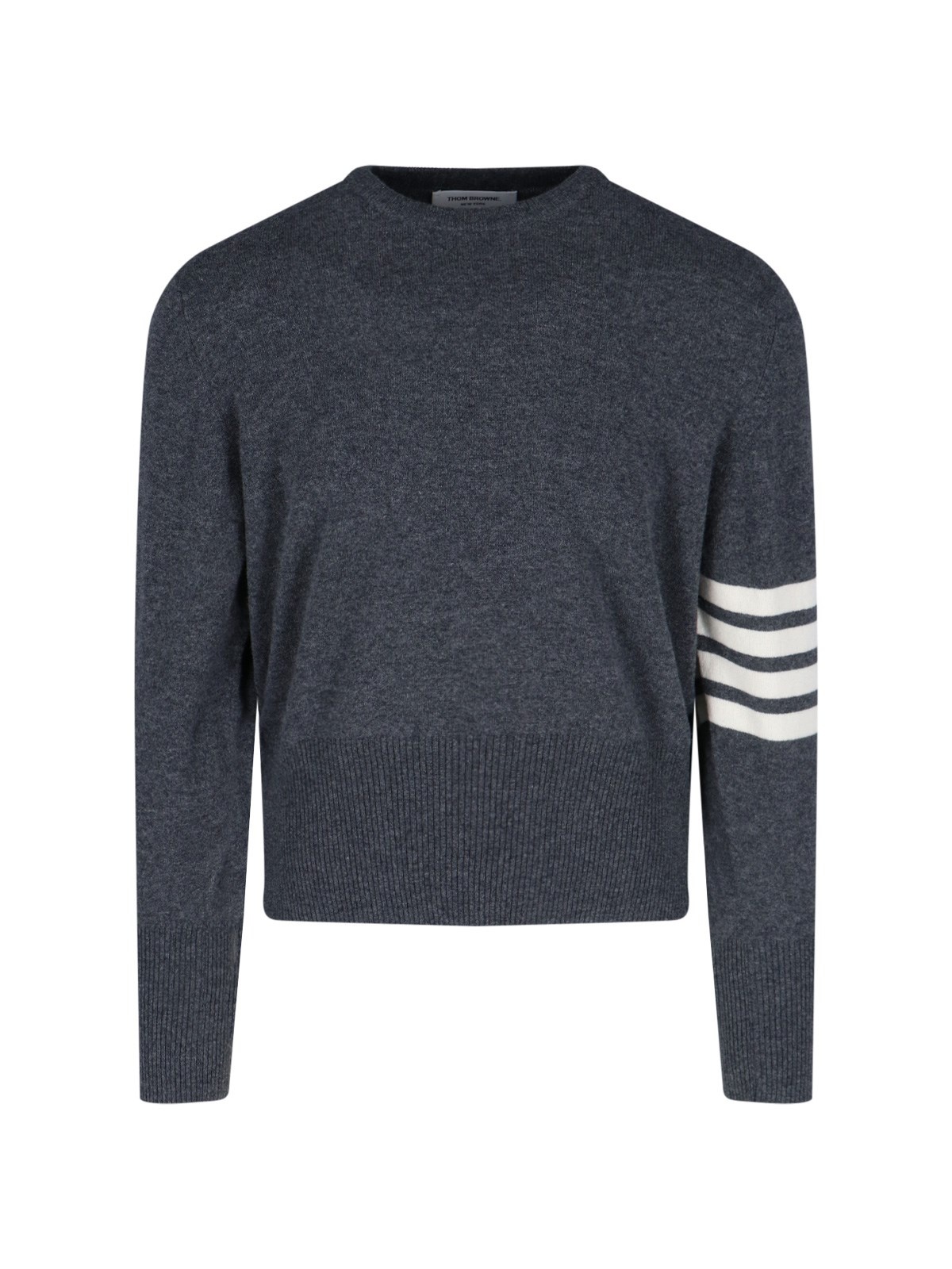 THOM BROWNE 'LOOPBACK 4-BAR' DARK CASHMERE COTTON SWEATER WITH CREW NECK, ICONIC WHITE SIDE BANDS, TRICOLOR GROSGRAIN LOGO LABEL ON THE BACK, BUTTON CUFFS, RIBBED TRIMS, STRAIGHT HEM. PRODUCT INFO PRODUCT CODE MKAS01A 00011038 COMPOSITION: 100% CASHMERE SIZE AND FIT: REGULAR FIT MADE IN: SCOTLAND - "NUMERIC" SIZE SCALE