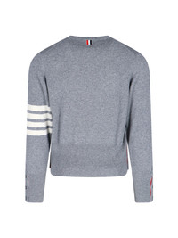 THOM BROWNE 'LOOPBACK 4-BAR' SWEATER IN LIGHT GREY CASHMERE WITH CREW NECK, ICONIC WHITE SIDE BANDS, TRICOLOR GROSGRAIN LOGO LABEL ON THE BACK, BUTTON CUFFS, RIBBED TRIMS, STRAIGHT HEM. PRODUCT INFO PRODUCT CODE MKAS01A 00011055 COMPOSITION: 100% CASHMERE SIZE AND FIT: REGULAR FIT MADE IN: SCOTLAND - "NUMERIC" SIZE SCALE