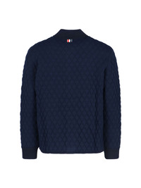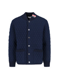 THOM BROWNE NAVY MERINO WOOL JACKET IN BLUE SHADES, DIAMOND JACQUARD PATTERN, V-NECK, MULTICOLOR LOGO INTARSIA DETAIL, BUTTON CLOSURE, TWO SIDE FLAT POCKETS, MULTICOLOR GROSGRAIN TAB AT THE BACK, RIBBED TRIM, STRAIGHT HEM. PRODUCT INFO PRODUCT CODE MKJ138A Y1029415 COMPOSITION: 70% VIRGIN WOOL, 27% POLYPROPYLENE, 3% POLYAMIDE SIZE AND FIT: REGULAR FIT MADE IN: ITALY - "NUMERIC" SIZE SCALE