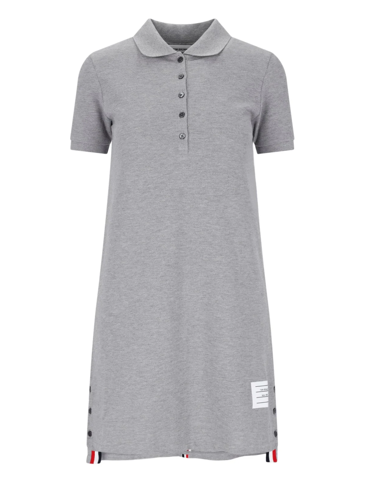 THOM BROWNE GRAY COTTON MINIDRESS WITH CLASSIC COLLAR, A BUTTON CLOSURE, SHORT SLEEVES, A FRONT LOGO LABEL, A TRICOLOR GROSGRAIN TONGUE DETAIL AT THE BACK, BUTTONS ON THE HEMLINE, AND A LONG BACK HEM. PRODUCT INFO PRODUCT CODE FJD027A 00050055 COMPOSITION: 100% COTTON SIZE AND FIT: ADJUST MADE IN: ITALIA