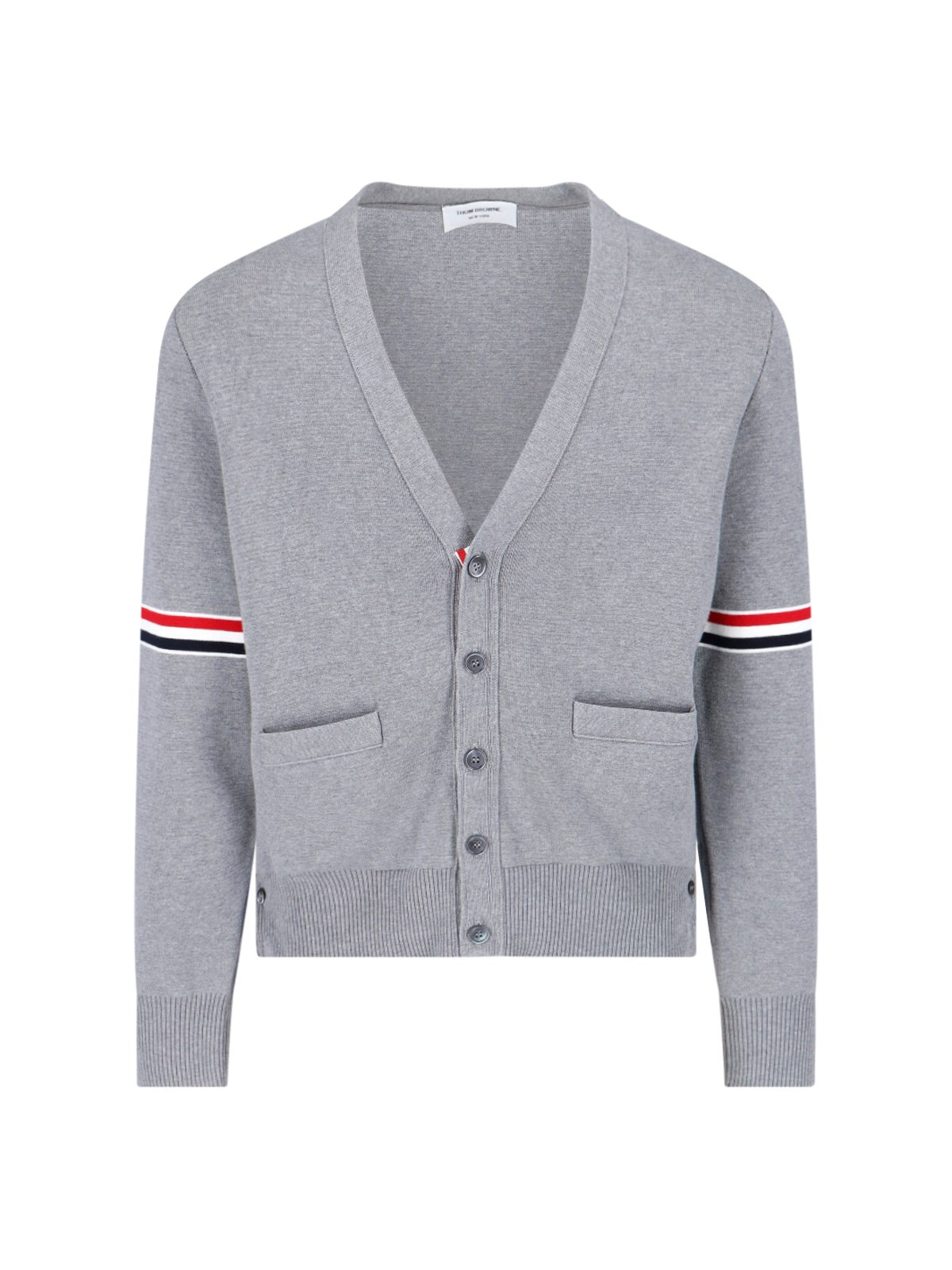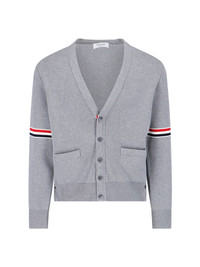 THOM BROWNE TRICOLOR COTTON CARDIGAN WITH V-NECK, BUTTON CLOSURE, GROSGRAIN BANDS, TRICOLOR SLEEVES, RIBBED TRIM, SIDE BUTTONS, AND A STRAIGHT HEM. PRODUCT INFO PRODUCT CODE MKC310A Y3007055 COMPOSITION: 100% COTTON SIZE AND FIT: ADJUST MADE IN: ITALIA - NUMERICAL CUTTING SCALE