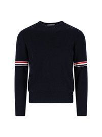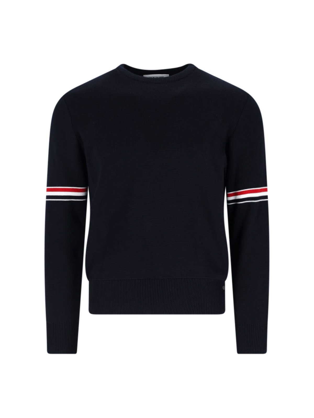 THOM BROWNE TRICOLOUR DETAIL SWEATER, COTTON STITCH MILANO, BLUE, RIBBED CREW NECK, LONG SLEEVES WITH TRICOLOR STRIPES ARMBAND, RIBBED HEM AND CUFFS WITH BUTTONS AND TRICOLOR DETAIL, BACK SIGNATURE LOGO LOOP TAB. PRODUCT INFO PRODUCT CODE MKA326A Y3001415 - NUMERIC SIZES - 100% COTTON - REGULAR FIT - MADE IN IRELAND - MKA326A Y3001-415