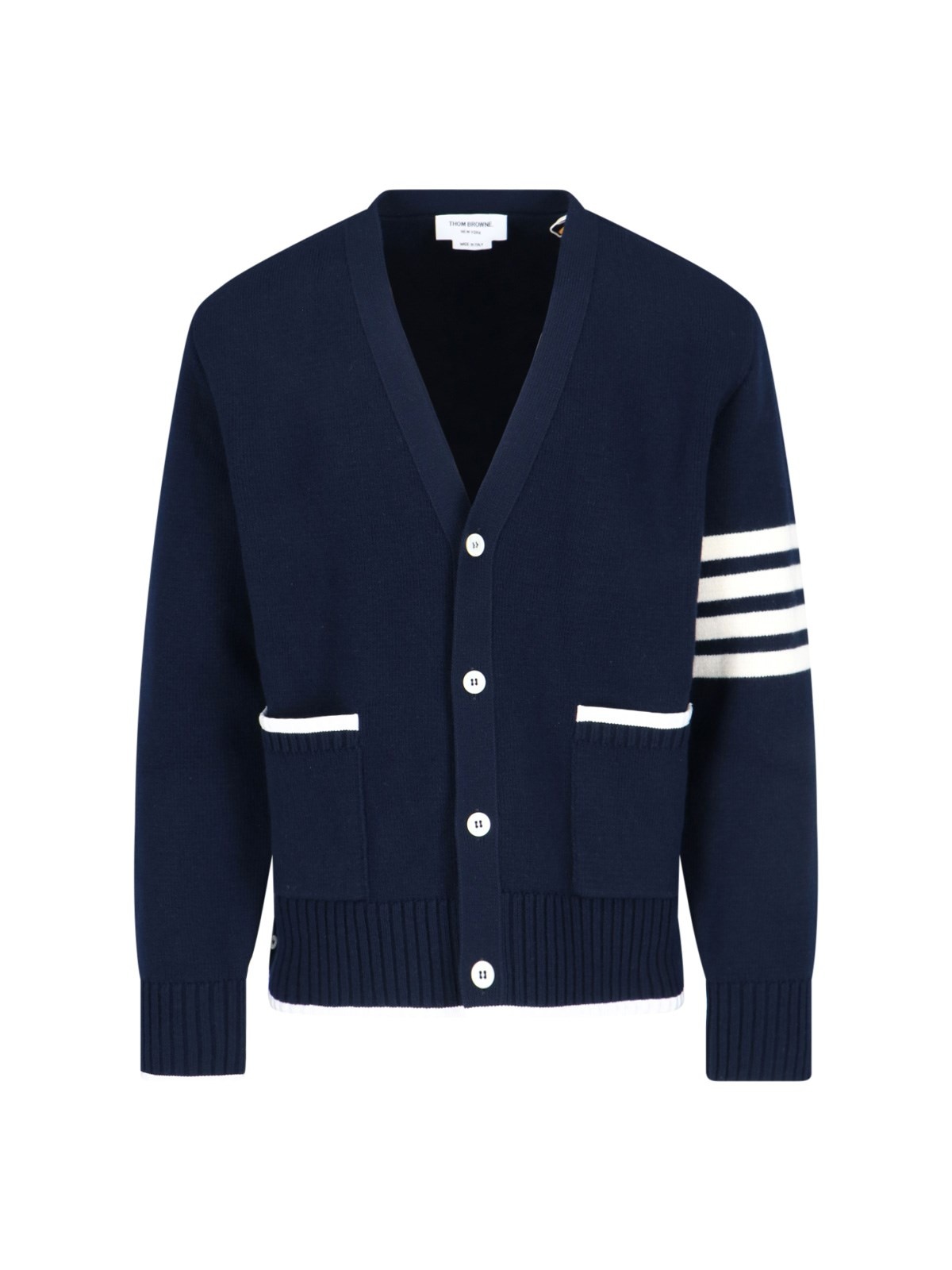 THOM BROWNE '4-BAR' NAVY BLUE VIRGIN WOOL CARDIGAN WITH V-NECK, BUTTON CLOSURE, TWO SIDE FLAT PATCH POCKETS, WHITE SIDE LOGO BAND INTARSIA, MULTICOLOR GROSGRAIN LOGO TAB AT THE BACK, BUTTON CUFFS, RIBBED TRIMS, STRAIGHT HEM. PRODUCT INFO PRODUCT CODE MKC608A Y1029415 COMPOSITION: 100% VIRGIN WOOL SIZE AND FIT: REGULAR FIT MADE IN: ITALY - "NUMERIC" SIZE SCALE