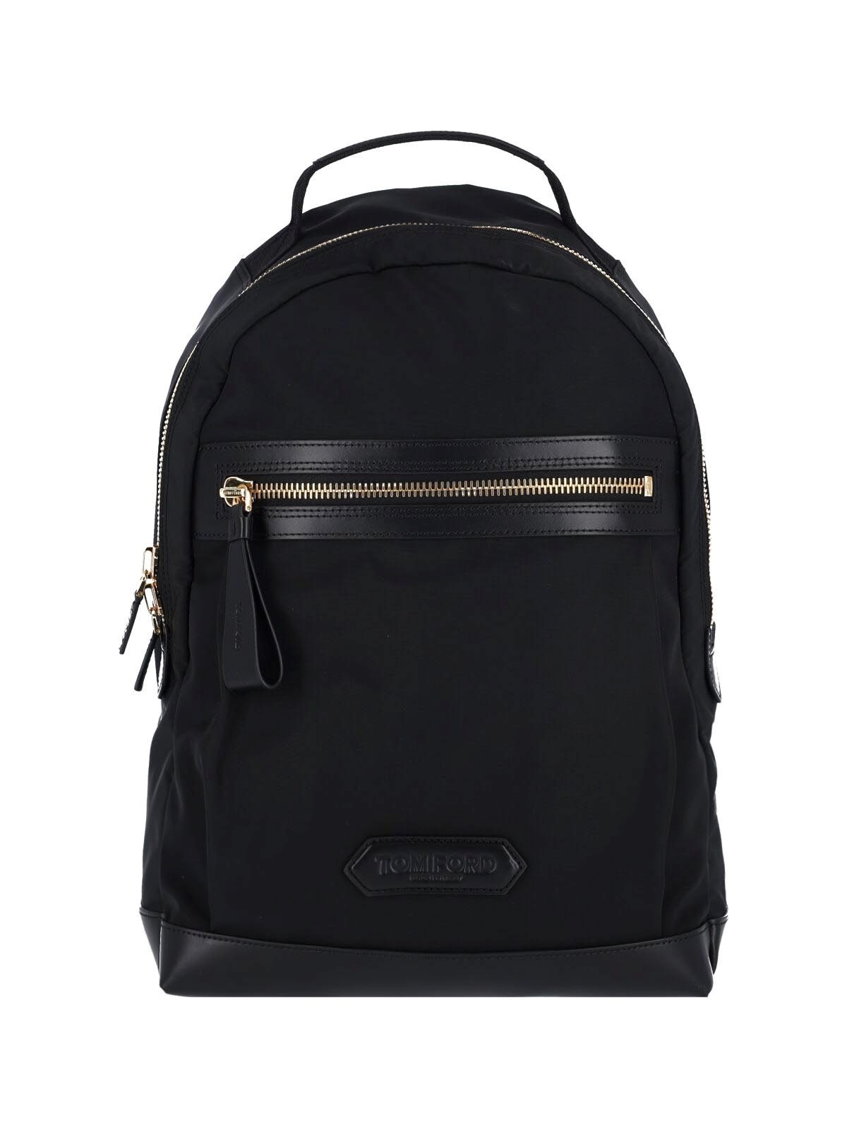 TOM FORD LOGO BACKPACK IN BLACK FABRIC WITH CALF LEATHER TRIM, HANDLE, TWO ADJUSTABLE BACK SHOULDER STRAPS, ZIP CLOSURE, MAXI FRONT ZIP POCKET, LOGO PATCH DETAIL, INNER ZIP POCKET, MAIN INNER COMPARTMENT. PRODUCT INFO PRODUCT CODE H0636 TNY017G1N001 COMPOSITION: 80% POLYESTER, 20% CALF LEATHER SIZE AND FIT: H 43 X W 28 X D 16 CM MADE IN: ITALY - TRIMS: 100% CALF LEATHER