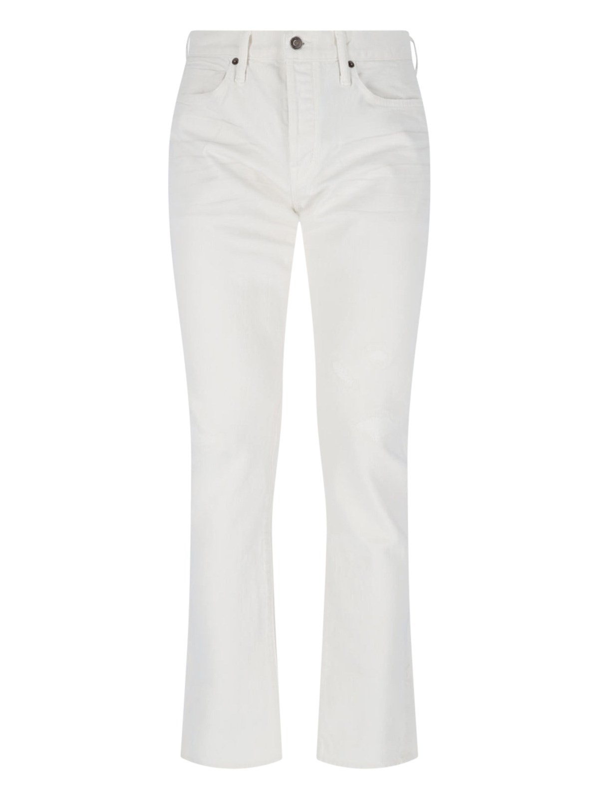 TOM FORD STRAIGHT JEANS IN WHITE DENIM WITH HIGH WAIST, BELT LOOPS, BUTTON CLOSURE, FIVE POCKET DESIGN, SIDE LOGO LABEL DETAIL, BACK LOGO PATCH, STRAIGHT LEG. PRODUCT INFO PRODUCT CODE DPH001 DMC059S25AW008 COMPOSITION: 98% COTTON, 2% POLYURETHANE SIZE AND FIT: SLIM FIT MADE IN: U.S.A.