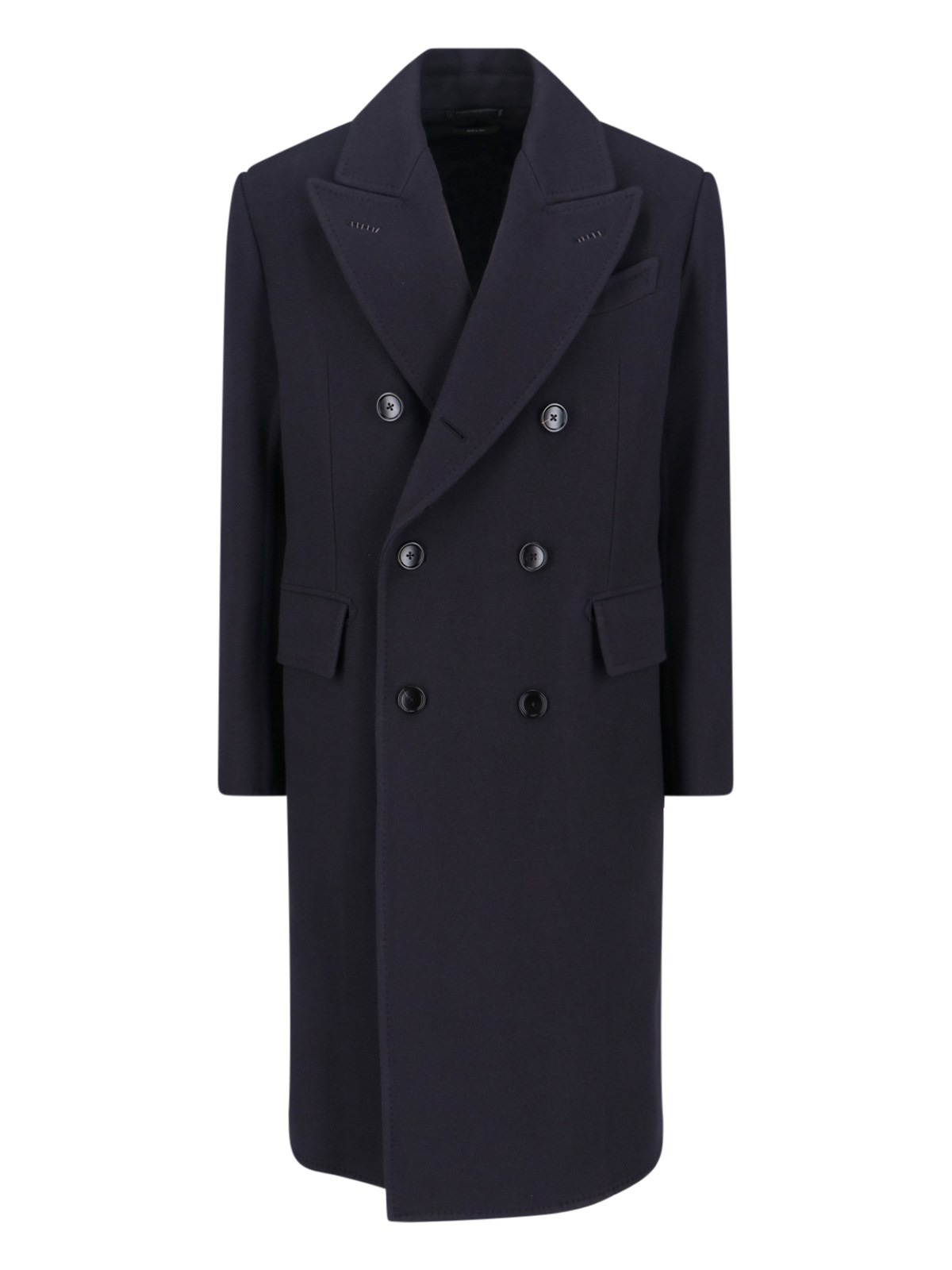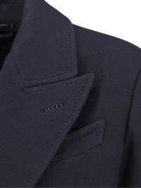 TOM FORD VIRGIN WOOL NAVY BLUE COAT WITH PEAK LAPELS, BUTTON CLOSURE, TWO SIDE POCKETS, ADJUSTABLE STRAP AT THE BACK, EXPOSED STITCHING DETAIL ON THE FRONT, INNER POCKET, MAXI SLIT AT THE BACK, STRAIGHT HEM. PRODUCT INFO PRODUCT CODE OCL012 FMW058HB825 COMPOSITION: 100% VIRGIN WOOL SIZE AND FIT: REGULAR FIT MADE IN: ITALY