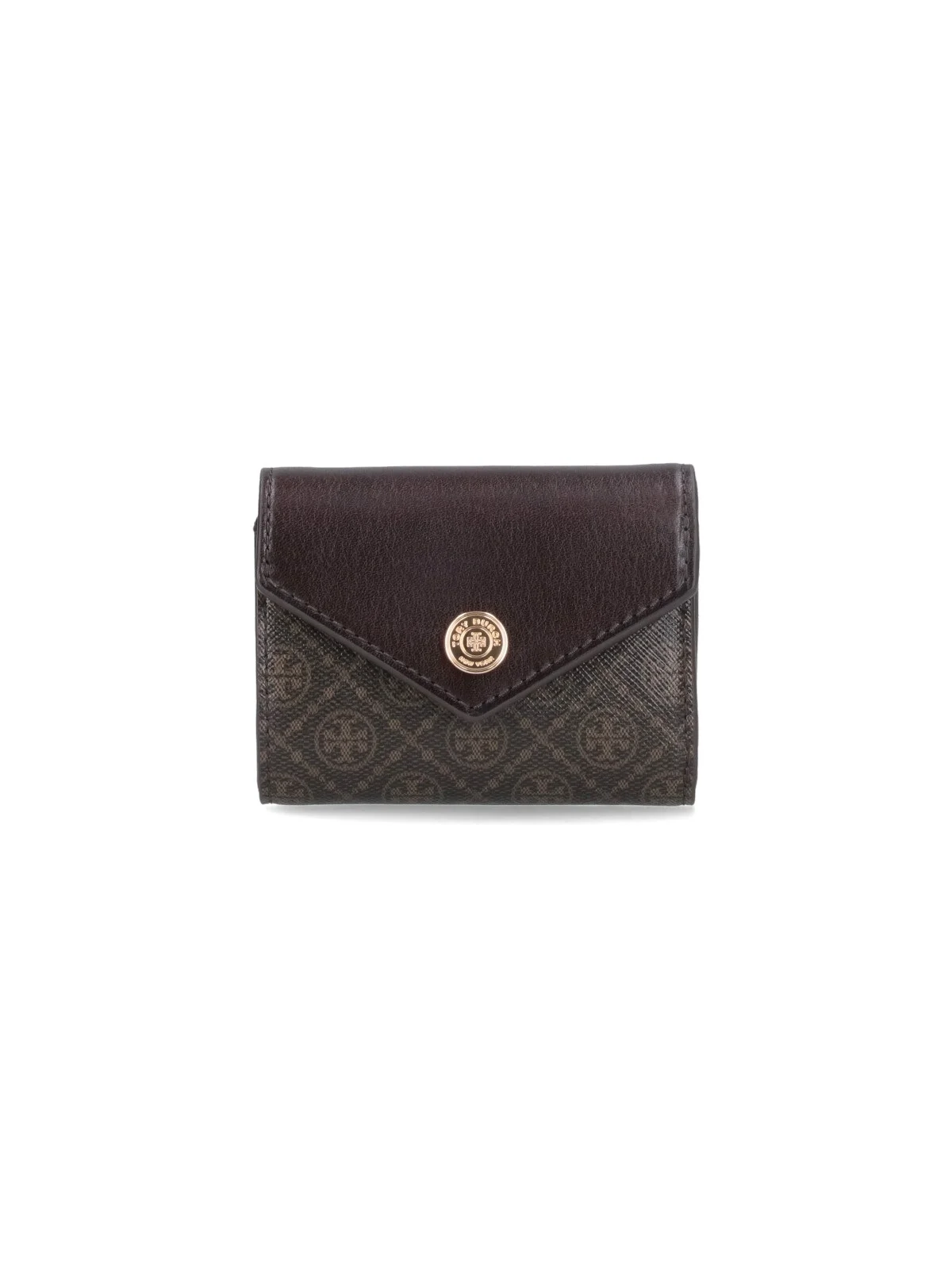 TORY BURCH 'T MONOGRAM' SMALL BROWN COTTON WALLET WITH LOGO PRINT PATTERN, LEATHER TRIMS, SNAP BUTTON FLAP CLOSURE, BACK ZIP POCKET, FOUR INNER CARD SLOTS, TWO INNER FLAT POCKETS, INNER BILL COMPARTMENT. PRODUCT INFO PRODUCT CODE 165026200 COMPOSITION: 98% COTTON, 2% OTHER FIBERS SIZE AND FIT: H 8 X W 10 CM MADE IN: VIETNAM - TRIMS: 100% LEATHER - PRODUCT MADE FROM CERTIFIED RAW MATERIALS (USDA/LWG)