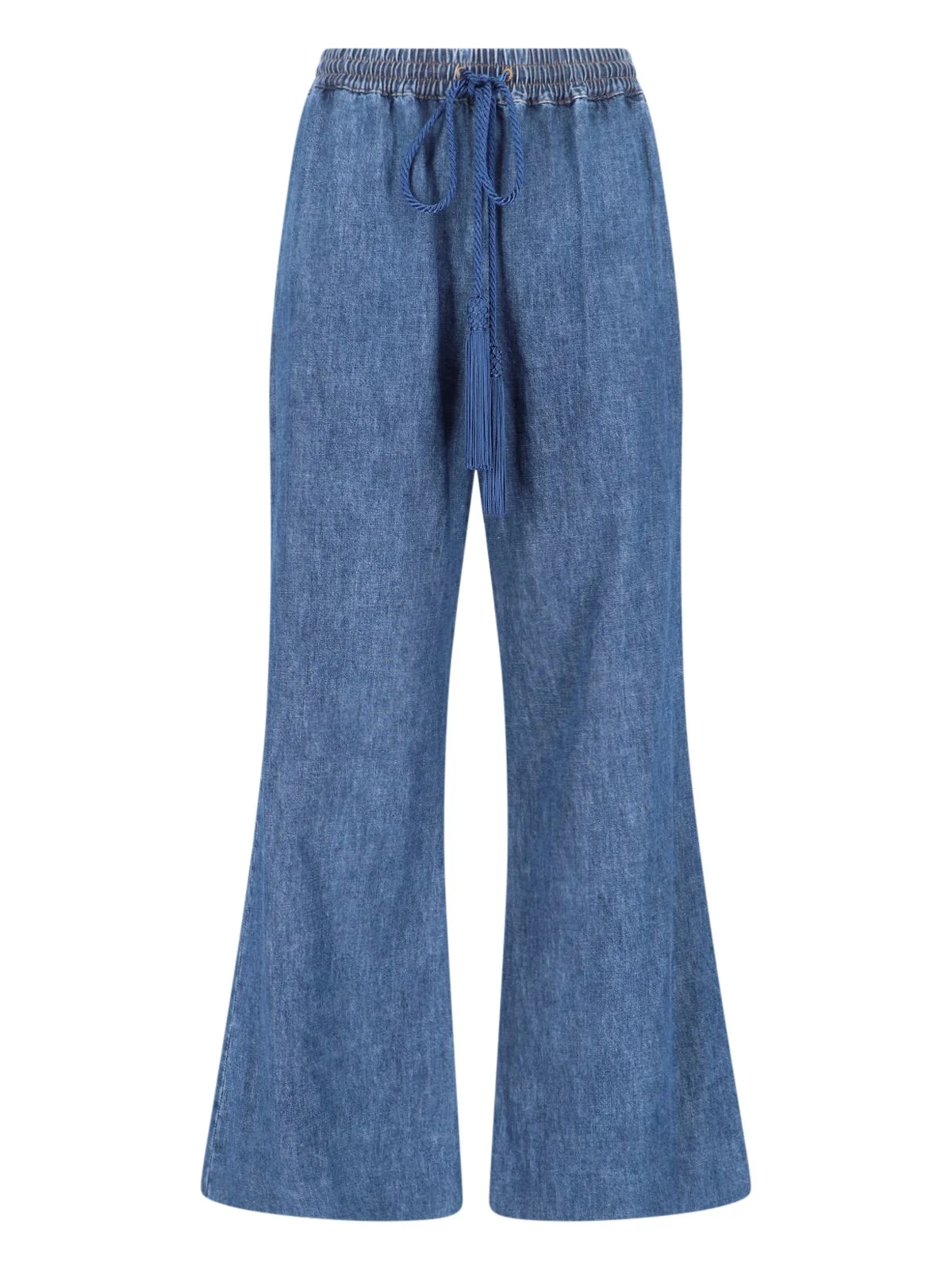 VALENTINO BOOTCUT JEANS IN BLUE COTTON DENIM WITH DISTRESSED WASH, MEDIUM ELASTIC WAISTBAND, LACES, TWO SIDE POCKETS, GOLD METAL "VGOLD" DETAIL ON THE BACK, TWO BACK POCKETS, WIDE LEG. PRODUCT INFO PRODUCT CODE 8B3DD21K9YA558 COMPOSITION: 100% COTTON SIZE AND FIT: REGULAR FIT MADE IN: ITALY