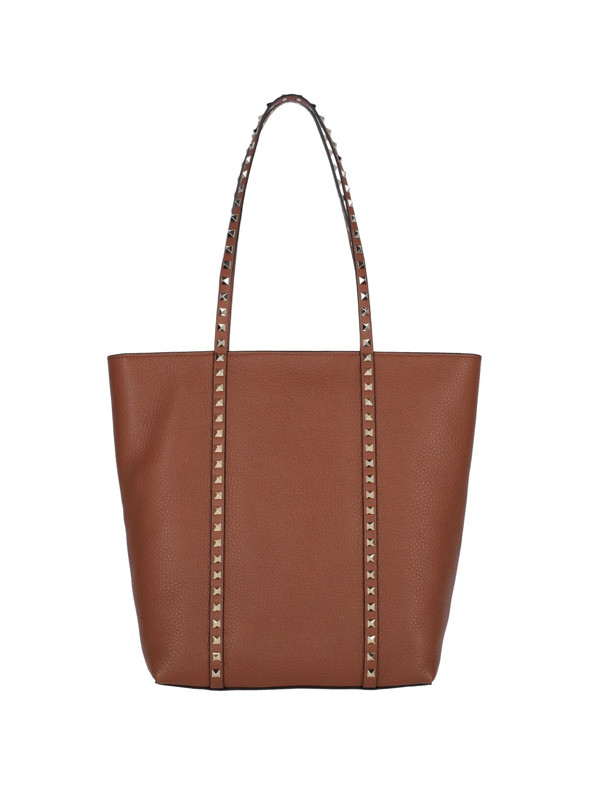 VALENTINO 'ROCKSTUD' TOTE BAG IN BROWN HAMMERED LEATHER WITH ALL-OVER GOLD METAL STUDS, TWO HANDLES, ZIP CLOSURE, REMOVABLE INNER ZIP POUCH, EMBOSSED LOGO DETAIL ON THE FRONT, MAIN INNER COMPARTMENT, METAL FEET ON THE BOTTOM. PRODUCT INFO PRODUCT CODE 6W2B0Q99VSFHG5 COMPOSITION: 100% CALF LEATHER SIZE AND FIT: H 31 X W 25 X D 14.5 CM MADE IN: ITALY - HANDLE DROP: 23 CM