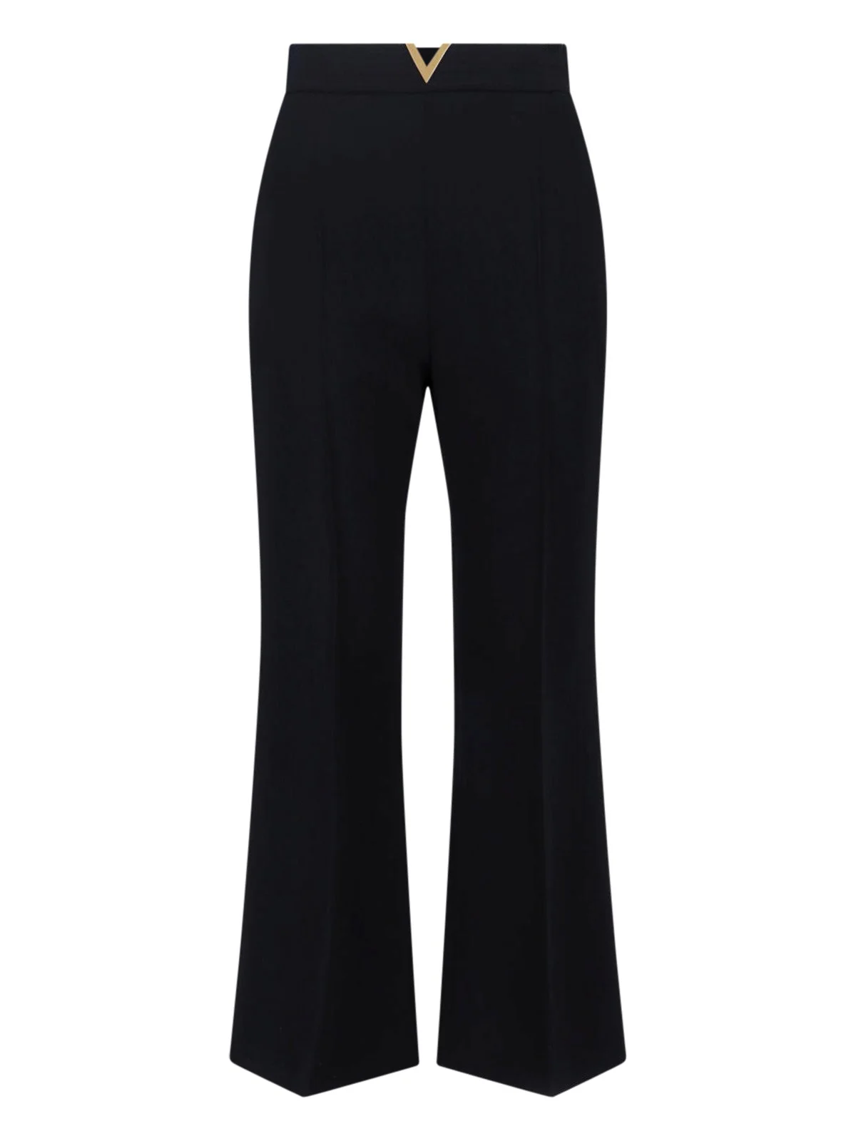 VALENTINO "VLOGO SIGNATURE" BLACK VIRGIN WOOL PANTS WITH HIGH WAIST, WAIST STRAP, GOLD METAL "VLOGO SIGNATURE" LOGO DETAIL AT THE WAIST, TWO SIDE POCKETS, TWO BACK WELT POCKETS, WIDE LEG. PRODUCT INFO PRODUCT CODE 8B3RB7209Q00NO COMPOSITION: 100% VIRGIN WOOL SIZE AND FIT: REGULAR FIT MADE IN: ITALY