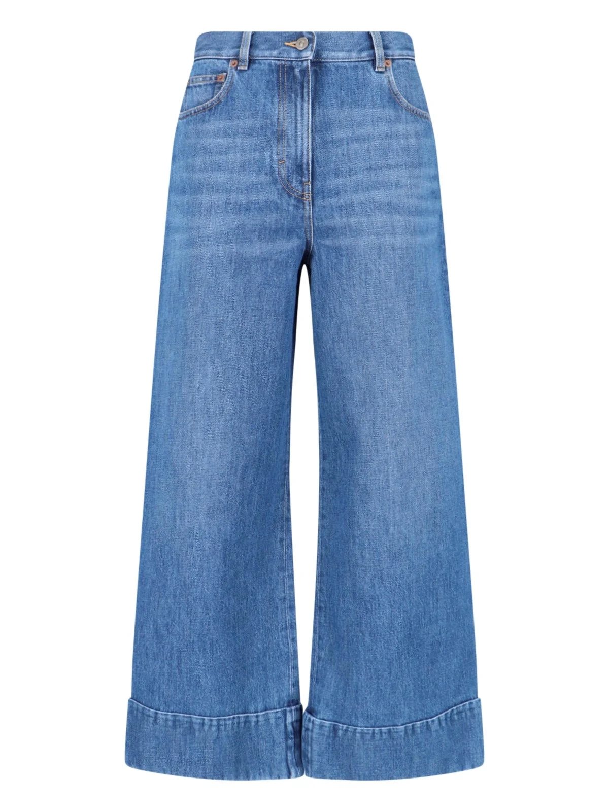 VALENTINO WIDE BLUE COTTON DENIM JEANS WITH MID WAIST, BUTTON AND ZIP CLOSURE, BELT LOOPS, FIVE POCKET DESIGN, GOLD METAL VLOGO SIGNATURE LOGO ON THE BACK, LEATHER LOGO PATCH ON THE BACK, WIDE LEG. PRODUCT INFO PRODUCT CODE 8B3DD29K9Y8558 COMPOSITION: 100% COTTON SIZE AND FIT: SOFT FIT MADE IN: ITALY
