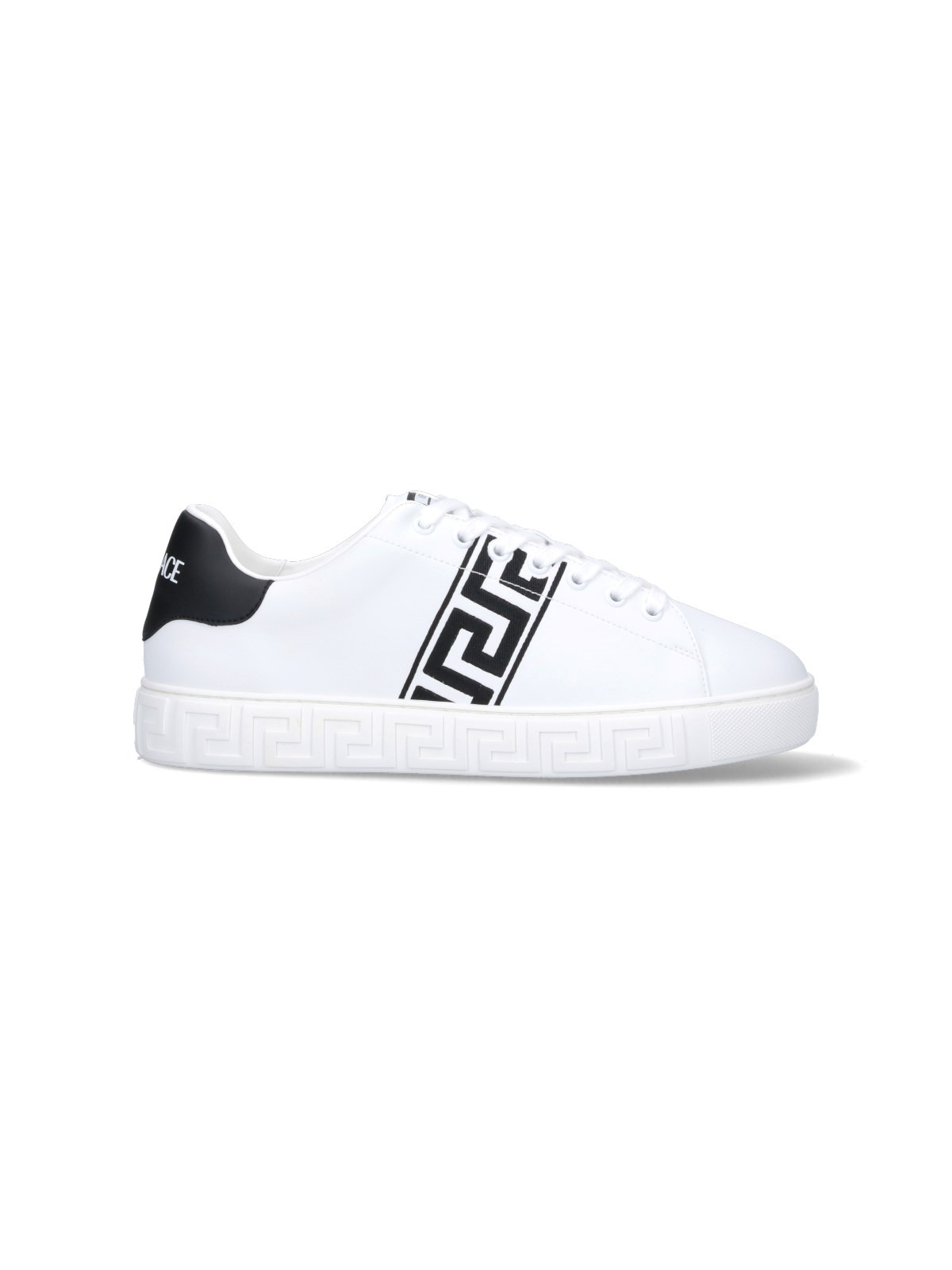 VERSACE GREEK EMBROIDERY SNEAKERS IN WHITE LEATHER WITH ROUND TOE, LACES, LOGO LABEL ON THE TONGUE, BLACK GREEK EMBROIDERY ON THE SIDE, BLACK TAB WITH CONTRASTING LOGO DETAIL, AND RUBBER SOLE GREEK MOTIF. PRODUCT INFO PRODUCT CODE 1014460 1A007762W020 COMPOSITION: 100% LEATHER MADE IN: ITALIA - SOLE: 100% RUBBER