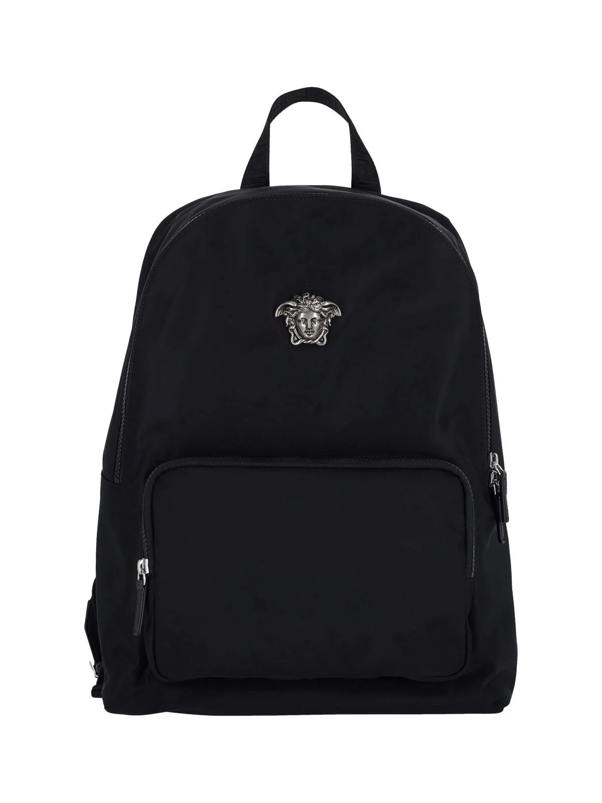 VERSACE "MEDUSA" BLACK NYLON BACKPACK WITH HANDLE, TWO ADJUSTABLE SHOULDER STRAPS AT THE BACK, "GRECA" PATTERN, DOUBLE ZIP CLOSURE, SILVER METAL LOGO ON THE FRONT, MAXI FRONT ZIP POCKET, SINGLE INNER COMPARTMENT. PRODUCT INFO PRODUCT CODE 1020645 1A149201B00P COMPOSITION: 100% NYLON SIZE AND FIT: H 40 X W 32 CM MADE IN: ITALY