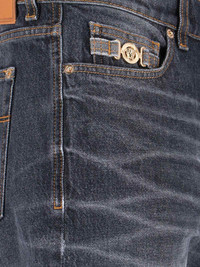 VERSACE MEDUSA BIGGIE BLUE COTTON JEANS WITH DISTRESSED WASH, MID WAIST, BELT LOOPS, BUTTON AND ZIP CLOSURE, FIVE-POCKET DESIGN, SIDE MEDUSA LOGO HARDWARE, BACK LOGO PATCH, STRAIGHT LEG. PRODUCT INFO PRODUCT CODE 1019462 1A151971D810 COMPOSITION: 100% COTTON, FINISHING: 100% CALF LEATHER SIZE AND FIT: REGULAR FIT MADE IN: ITALY