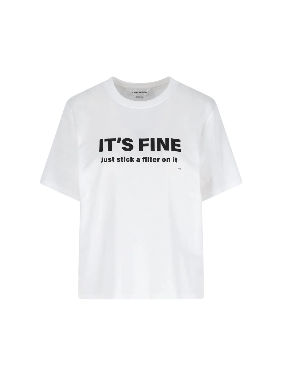 VICTORIA BECKHAM 'IT'S FINE' WHITE COTTON CREW NECK T-SHIRT WITH SHORT SLEEVES, CONTRAST PRINT ON THE FRONT, LOGO EMBROIDERY AT THE BACK, STRAIGHT HEM. PRODUCT INFO PRODUCT CODE 1126JTS007232AWHITE COMPOSITION: 100% COTTON SIZE AND FIT: REGULAR FIT MADE IN: PORTUGAL