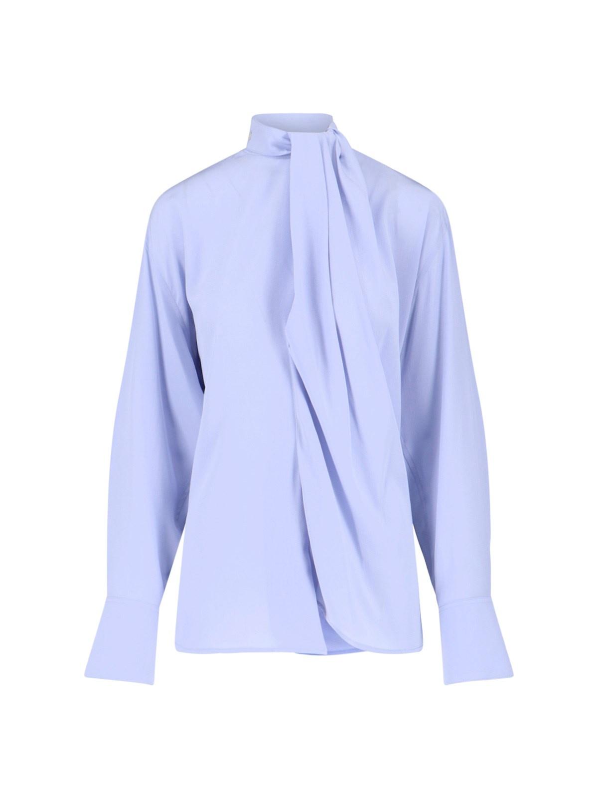 VICTORIA BECKHAM LAVALLIERE SILK SHIRT IN LIGHT BLUE WITH ALL-OVER DRAPED DETAILS, LAVALLIERE COLLAR, BUTTONS ON THE CUFFS, AND STRAIGHT HEM. PRODUCT INFO PRODUCT CODE 1325WSH006594ADELPHINIUM COMPOSITION: 100% SILK SIZE AND FIT: REGULAR FIT MADE IN: PORTUGAL