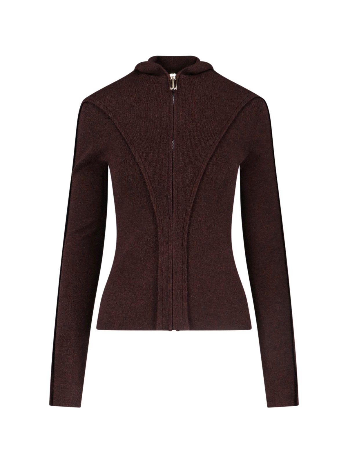 VICTORIA BECKHAM LOGO ZIP SWEATSHIRT IN DARK BROWN MERINO WOOL BLEND WITH HOOD, ZIP CLOSURE, GOLD METAL LOGO ZIPPER CHARM DETAIL, STRAIGHT HEM. PRODUCT INFO PRODUCT CODE 1325KTP006406ADARK CHOCOLATE COMPOSITION: 82% MERINO WOOL, 16% NYLON, 2% ELASTANE SIZE AND FIT: REGULAR FIT MADE IN: CHINA