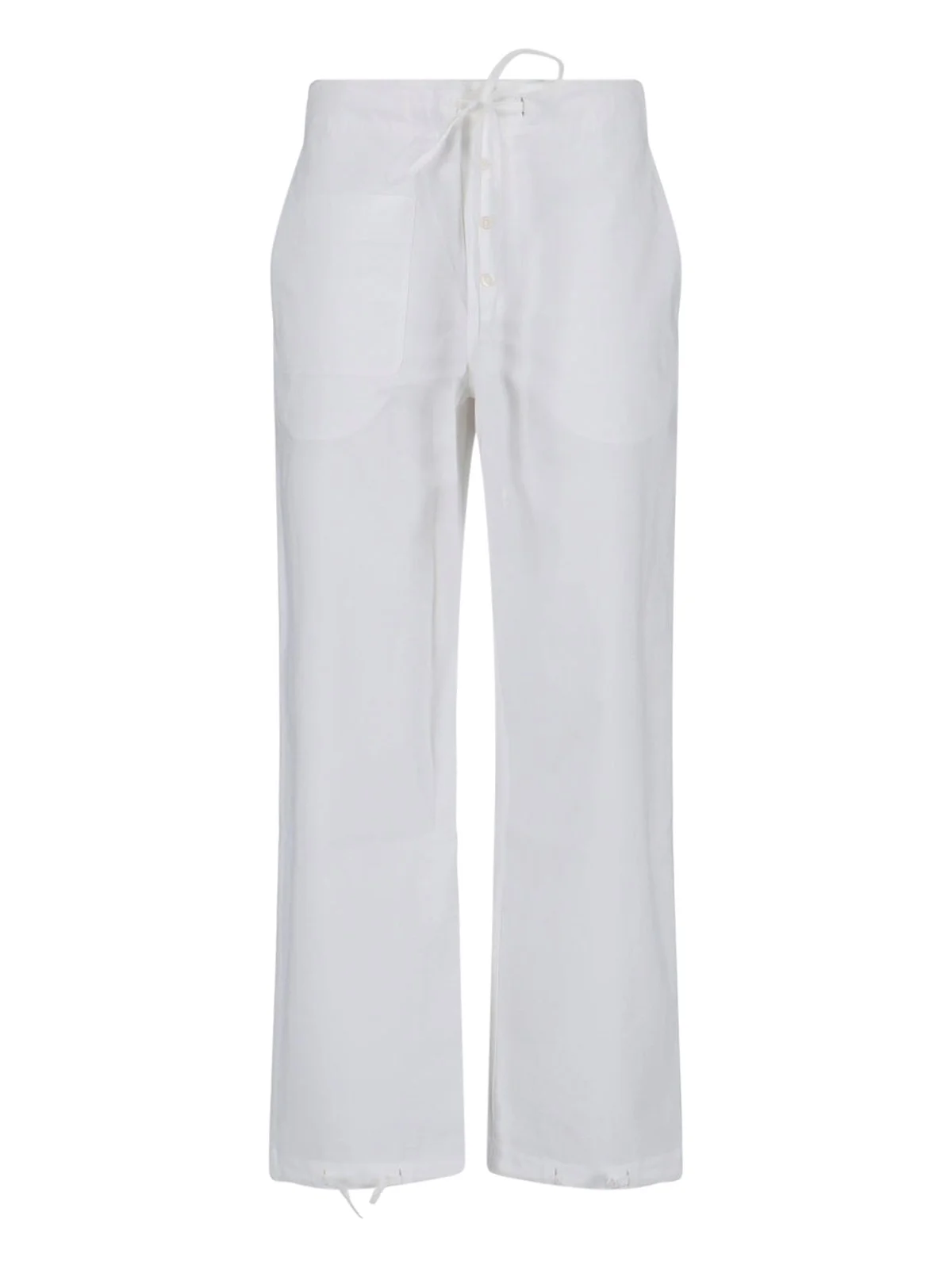 VICTORIA BECKHAM WHITE POPLIN PANTS WITH MID WAIST, ADJUSTABLE DRAWSTRING AT THE WAIST, FRONT BUTTON CLOSURE, TWO SIDE POCKETS, TWO BACK POCKETS, STRAIGHT LEG. PRODUCT INFO PRODUCT CODE 1126WTR006981AWHITE COMPOSITION: 98% COTTON, 2% ELASTANE SIZE AND FIT: REGULAR FIT MADE IN: TURKEY