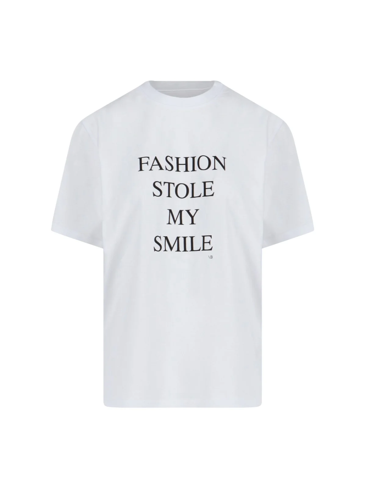 VICTORIA BECKHAM SLOGAN T-SHIRT IN WHITE COTTON WITH CONTRASTING DETAILS, CREWNECK, SHORT SLEEVES, FASHION STOLE MY SMILE LETTERING PRINT ON THE FRONT, RED LOGO EMBROIDERY ON THE BACK, RIBBED TRIM, AND STRAIGHT HEM. PRODUCT INFO PRODUCT CODE 1322JTS004130AWHITE COMPOSITION: 100% COTTON SIZE AND FIT: REGULAR FIT MADE IN: PORTUGAL