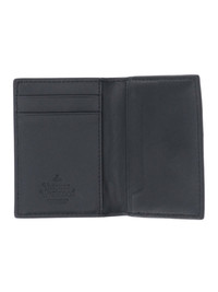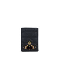 VIVIENNE WESTWOOD BIFOLD LOGO PASSPORT HOLDER IN BLACK LEATHER WITH QUILTED AND PADDED DESIGN, GOLD METAL ORB LOGO ON THE FRONT, TWO INTERNAL CARD SLOTS, AN INTERNAL DOCUMENT POCKET. PRODUCT INFO PRODUCT CODE 5115002WU L006UN403 COMPOSITION: 100% LEATHER SIZE AND FIT: H 14 X W 11 X D 1.5 CM MADE IN: ITALY