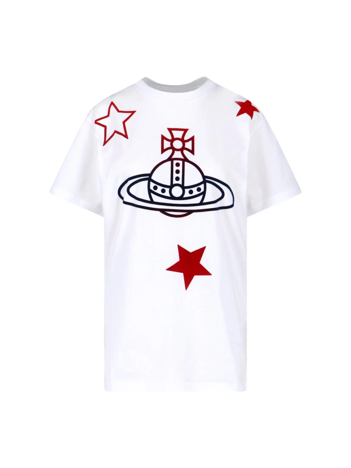 VIVIENNE WESTWOOD 'ORB AND STARS' WHITE COTTON CREW NECK T-SHIRT WITH SHORT SLEEVES, CONTRAST FLOCKED 'ORB' LOGO AT THE FRONT. PRODUCT INFO PRODUCT CODE 3G010056 J00B9A401 COMPOSITION: 100% COTTON SIZE AND FIT: REGULAR FIT MADE IN: TURKEY