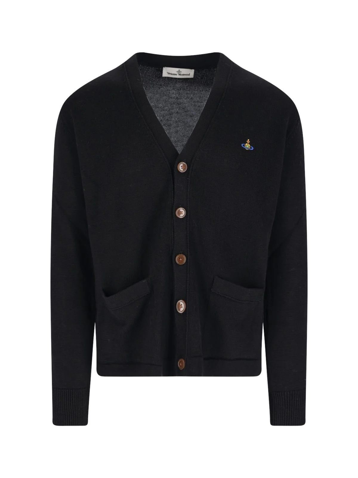 VIVIENNE WESTWOOD 'ORB' CARDIGAN IN BLACK VIRGIN WOOL WITH V-NECK, BUTTON CLOSURE, TWO FRONT POCKETS, MULTICOLOR 'ORB' LOGO EMBROIDERY ON THE FRONT, RIBBED TRIMS, STRAIGHT HEM. PRODUCT INFO PRODUCT CODE 27010014 Y002MN401 COMPOSITION: 100% VIRGIN WOOL SIZE AND FIT: REGULAR FIT MADE IN: ITALY