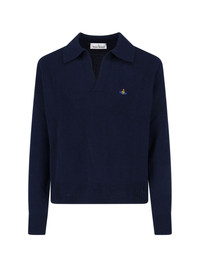 VIVIENNE WESTWOOD 'ORB' SWEATER IN DARK VIRGIN WOOL AND BLUE CASHMERE BLEND WITH CLASSIC COLLAR, V-NECK, CONTRAST 'ORB' LOGO EMBROIDERY AT THE FRONT, RIBBED TRIM, STRAIGHT HEM. PRODUCT INFO PRODUCT CODE 2701002Y Y0018K410 COMPOSITION: 90% MERINO WOOL, 10% CASHMERE SIZE AND FIT: REGULAR FIT MADE IN: ITALY