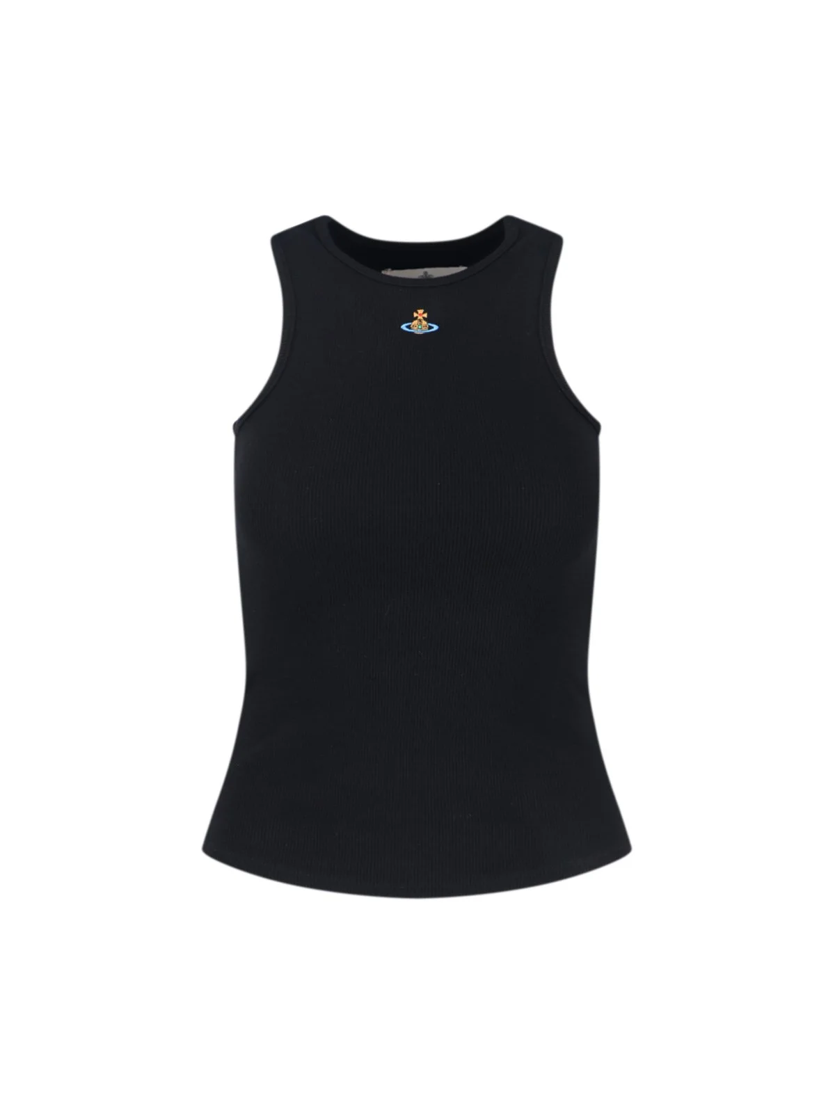 VIVIENNE WESTWOOD ORB TANK TOP IN BLACK COTTON WITH KNITTED, ROUND NECKLINE, MULTICOLOR ORB LOGO EMBROIDERY ON THE FRONT, CURVED HEM. PRODUCT INFO PRODUCT CODE 3G01003Z J009CN401 COMPOSITION: 95% COTTON, 5% ELASTANE SIZE AND FIT: REGULAR FIT MADE IN: TUNISIA
