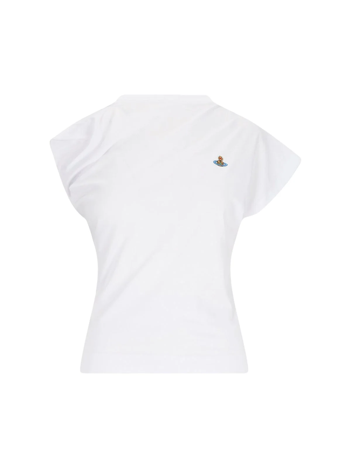 VIVIENNE WESTWOOD HEBO TOP IN WHITE COTTON WITH DRAPED DESIGN, CREWNECK, ASYMMETRICAL SHORT SLEEVES, MULTICOLOR ORB EMBROIDERED LOGO ON THE CHEST, AND STRAIGHT HEM. PRODUCT INFO PRODUCT CODE 1504000A J001MA401 COMPOSITION: 100% COTTON SIZE AND FIT: REGULAR FIT MADE IN: TUNISIA