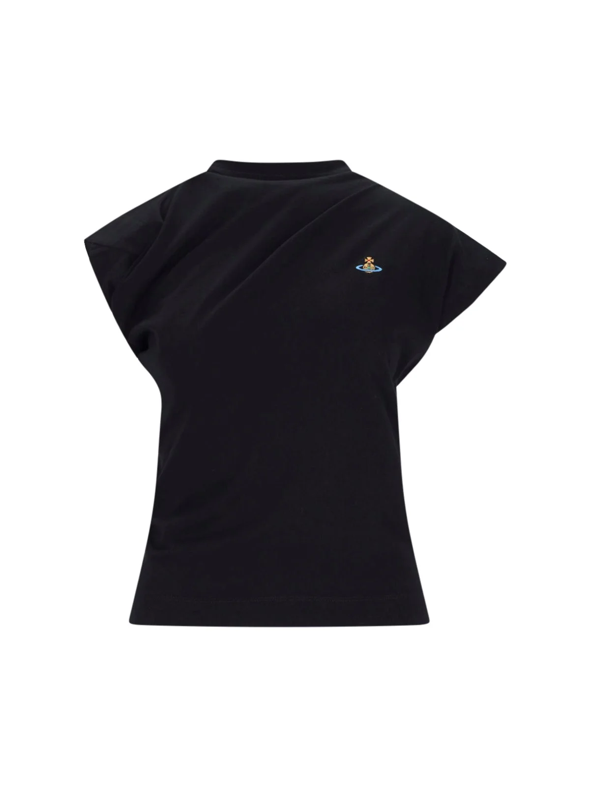 VIVIENNE WESTWOOD 'HEBO' TOP IN BLACK COTTON WITH DRAPED DESIGN, CREW NECK, ASYMMETRICAL SHORT SLEEVES, MULTICOLOR 'ORB' LOGO EMBROIDERY ON THE CHEST, STRAIGHT HEM. PRODUCT INFO PRODUCT CODE 1504000A J001MN401 COMPOSITION: 100% COTTON SIZE AND FIT: REGULAR FIT MADE IN: TUNISIA
