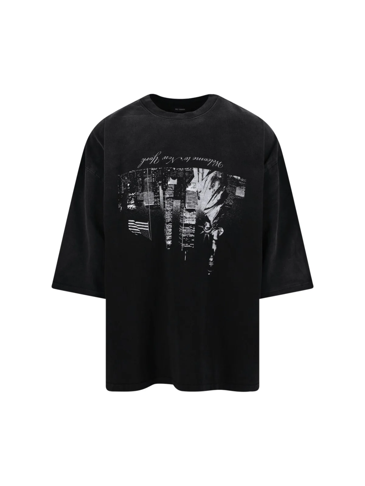 WILLY CHAVARRIA 'WELCOME TO NY' BLACK COTTON T-SHIRT WITH DISTRESSED EFFECT, CREW NECK, DROPPED SHOULDERS, HALF SLEEVES, CONTRAST LOGO PRINT ON THE FRONT, RIBBED TRIMS, STRAIGHT HEM. PRODUCT INFO PRODUCT CODE WCJSY0122001 COMPOSITION: 100% COTTON SIZE AND FIT: OVERSIZED FIT MADE IN: UNITED STATES OF AMERICA