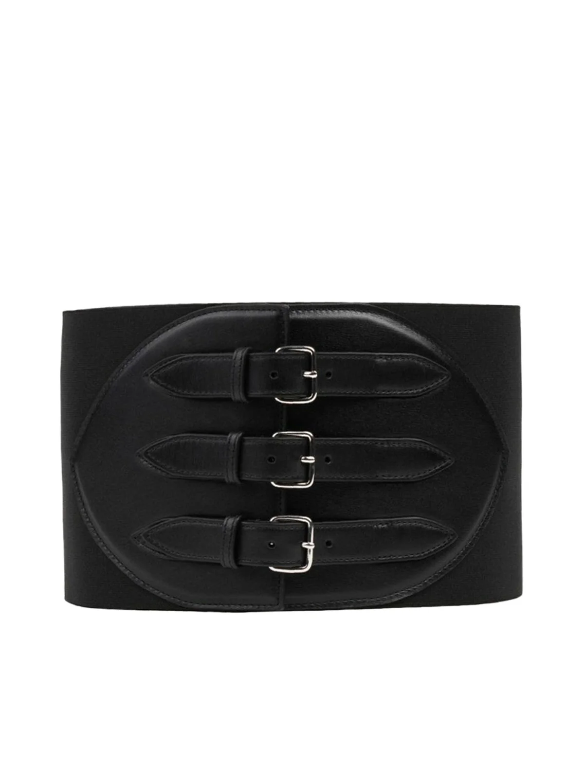 Stretch corset belt with three buckles; encircles the waist; the integral elastic offers optimal comfort and ease. Dimensions (cm): h 14 Made in Italy Composition: Calf Leather 100% calf Leather Color code: 999 NOIR AA1C008GCA110
