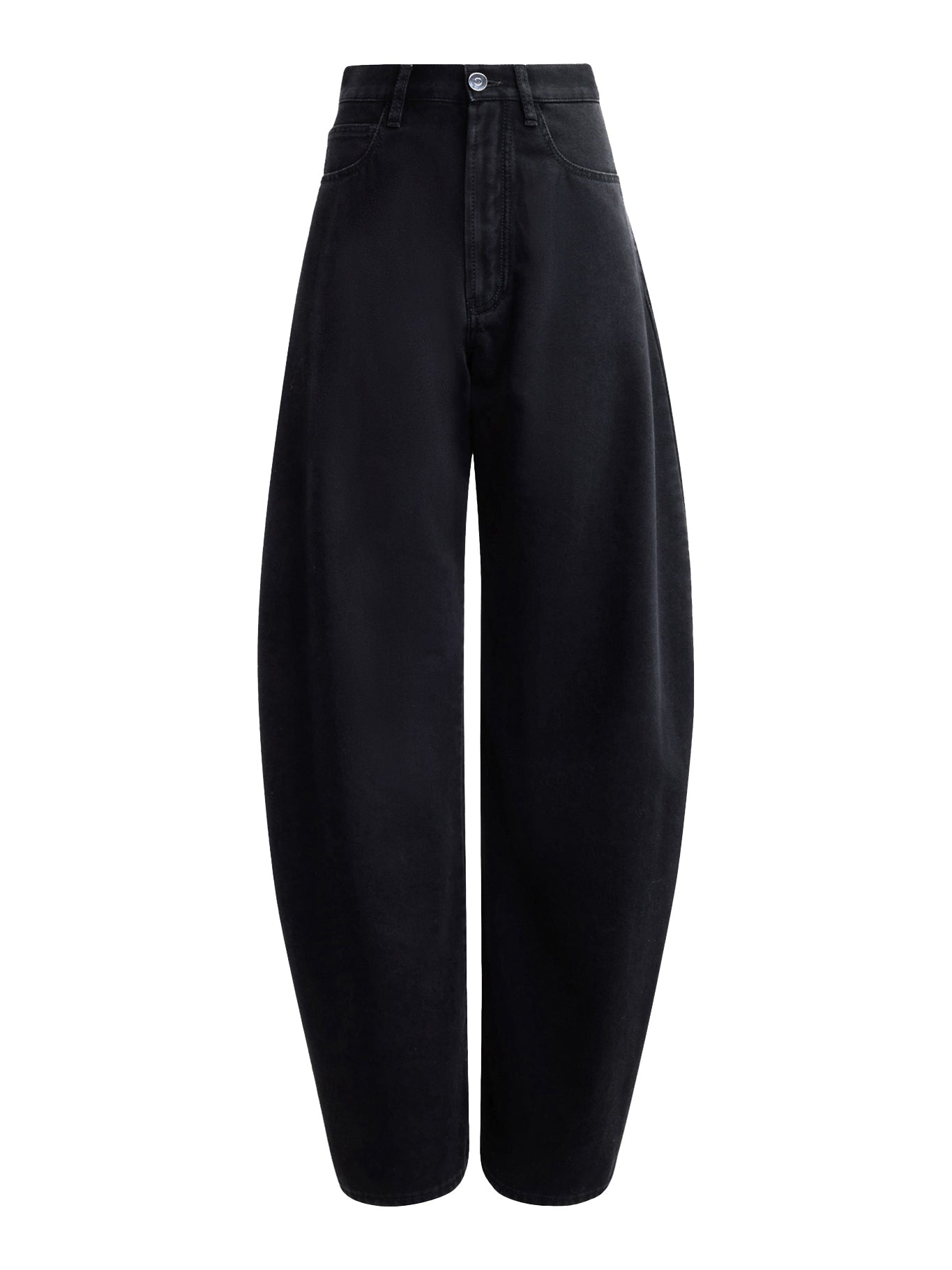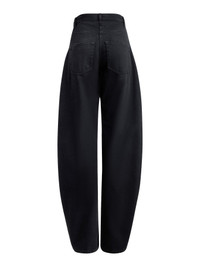 -Black denim barrel-leg jeans -Curved cut -High waist, zipper, belt loops Made in Italy Composition: Cotton 99% Cotton 1% polyurethane Color code: 995 NOIR ALAIA AA9P0176D003A