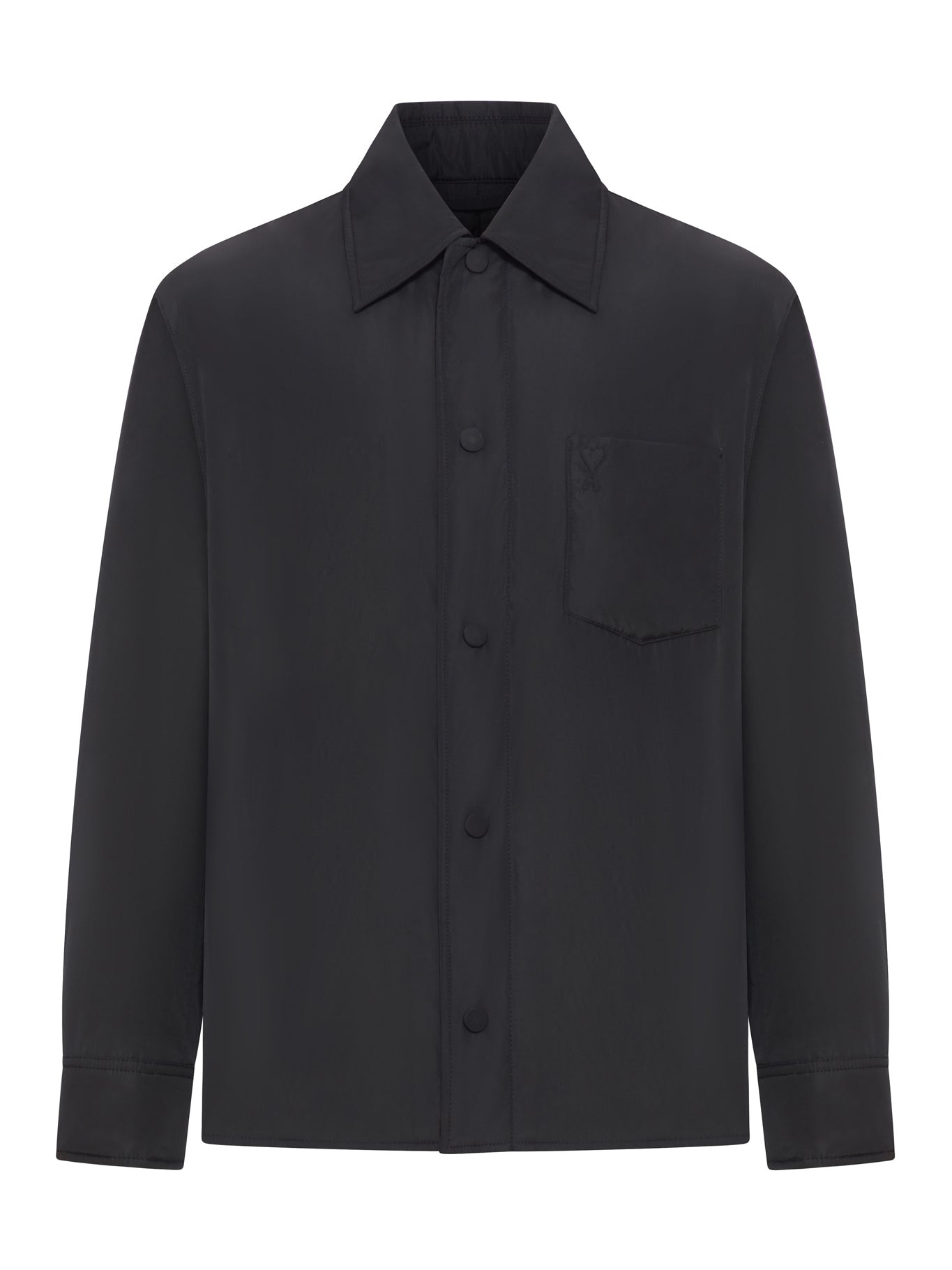 - Padded shirt in technical taffeta - Front button closure - Snap-button cuffs covered in the main fabric - Patch chest pocket - Fully lined and padded - Embossed "Ami de Coeur" lettering - Stitched chest pocket - Water-repellent fabric Made in Romania Composition: Polyester 100% polyester Color code: 001 NOIR HJK829PL0039