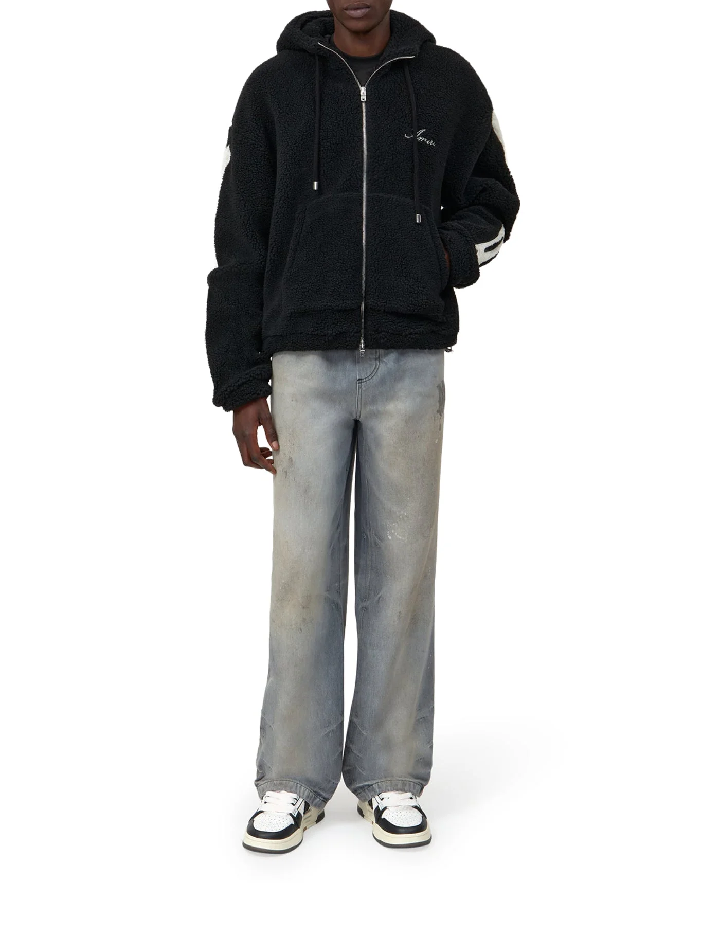 - Front two-way metal zip closure - Adjustable drawstring hood - Long sleeves - Contrasting embroidered Amiri logo - Front kangaroo pocket - Bones embroidery on the sleeves - Teddy effect - Color: Black Made in Italy Composition: Polyester 100% polyester Color code: 001 BLACK AMOUJA1010