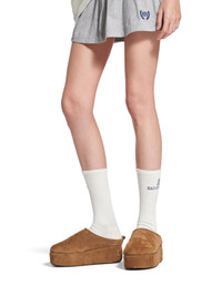 - Split calfskin and wool - Mules - Rounded toe - Open back - 50 mm wedge height - Balenciaga logo on the upper - Balenciaga logo and printed details on the back - Black sole Made in Italy Composition: Calf Leather 100% Calf Leather Color code: 2200 BROWN WHITE 825258WBFC1