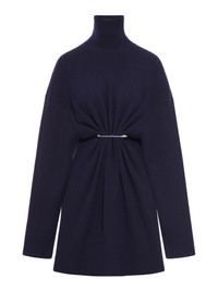 - Draped wool and cotton sweater - Ribbed - Wide, soft turtleneck - Dropped shoulders - Long sleeves - Front waist with darts and silver-plated brass clips - Color Blue Made in Italy Composition: Cotton 54% Cotton 46% wool Color code: 4140 NAVY 850028T1759