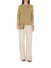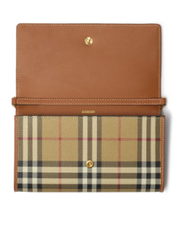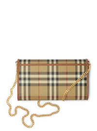 - Coated cotton blend chain wallet - Burberry Check pattern on the exterior and solid color on the interior - Chain shoulder strap - Flap with snap closure - 12 card slots - Interior zip compartment, two interior compartments, two interior slip pockets - Hand-painted edges - Polished metal hardware - Lined - Comes with a protective pouch - Color: Beige/Brown Made in Moldavia Composition: Polyurethane 55% Polyurethane 25% Polyethilene 20% Cotton Color code: A9534 VNTG CHK BRIAR BROWN 8109798