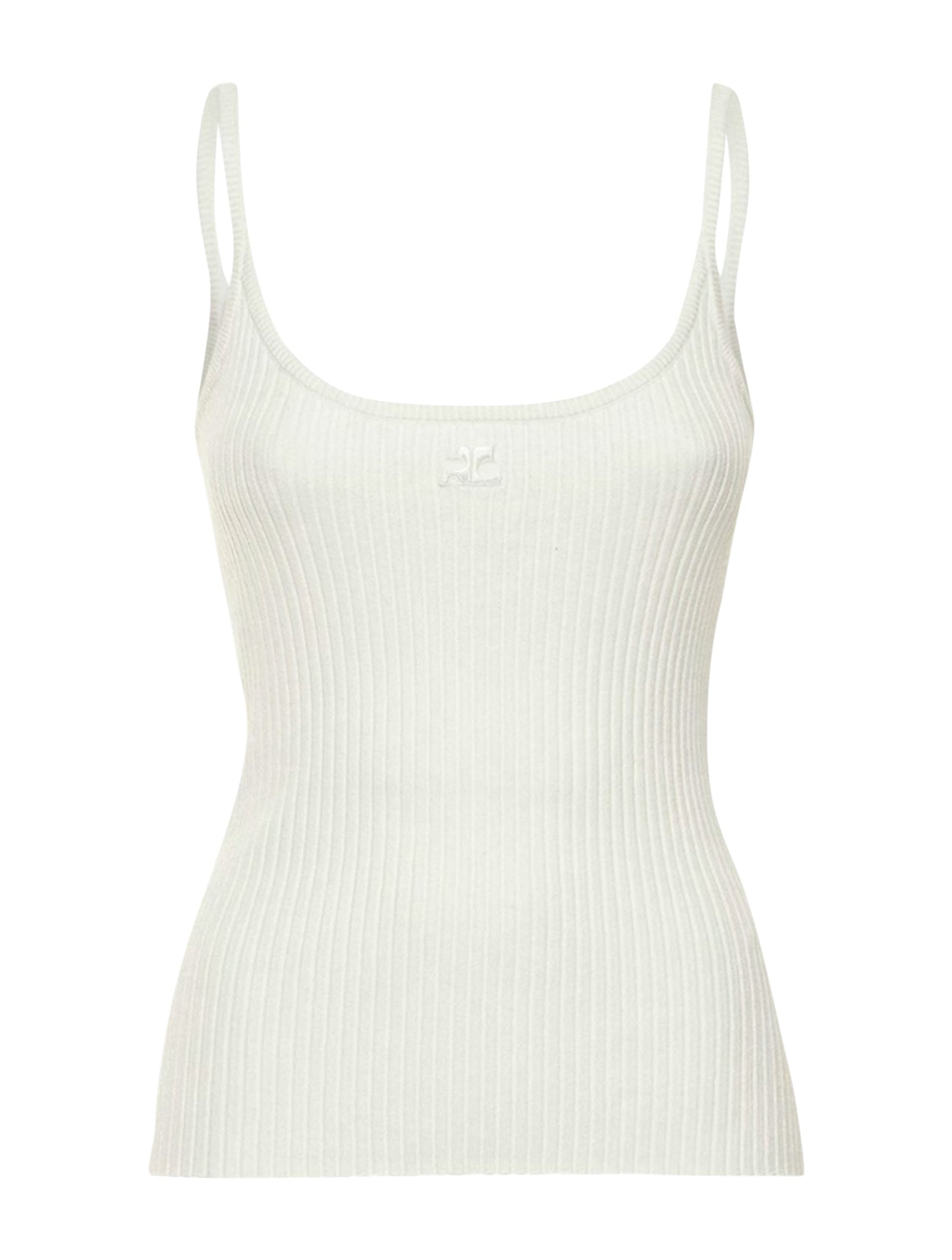 -round neckline -thin straps -ribbed fabric -embroidered logo Made in Bulgaria Composition: Viscose 70% Viscose 30% Polyester Color code: 0001 HERITAGE WHITE PERMDE012FI0001