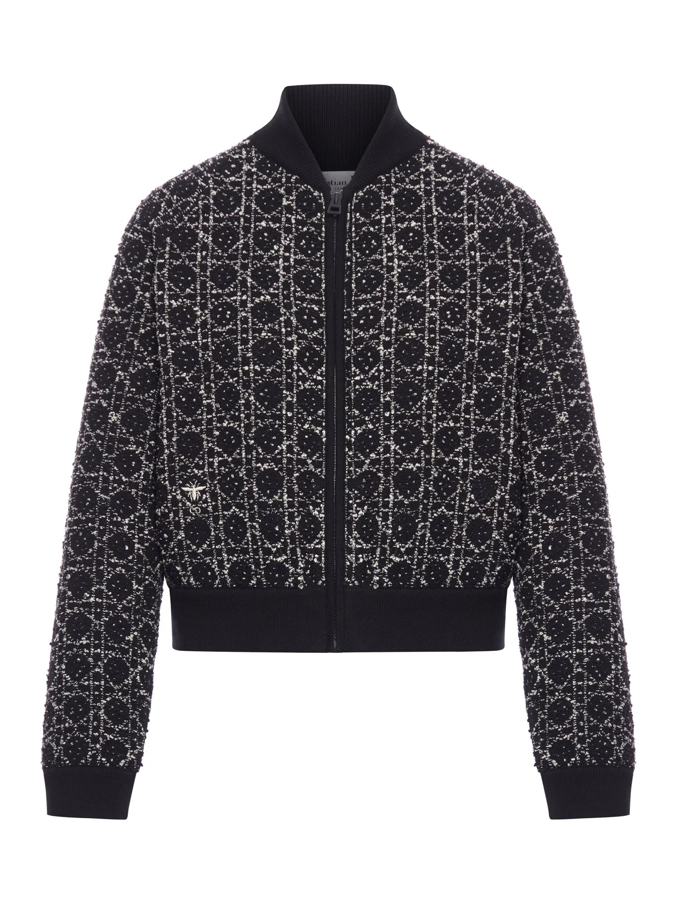 - Black and white cotton blend tweed with a textured effect - Regular fit - Ribbed trim - Embroidered bee symbol and CD signature - Front zip closure - Ribbed collar, hem, and cuffs - Tone-on-tone lining - Color: Black/White Made in Italy Composition: Cotton 64% Cotton 27% polyester 7% acrylic 2% polyamide Color code: 9101 FANTASIE 614V50A7520