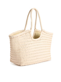 - Hand-woven shoulder bag - Buffalo calfskin - Unlined - Top width: 46 cm - Bottom width: 35 cm - Length: 22 cm - Handle length: 24 cm - Color: Sand Made in India Composition: Leather 100% leather Color code: SAND DGS68822